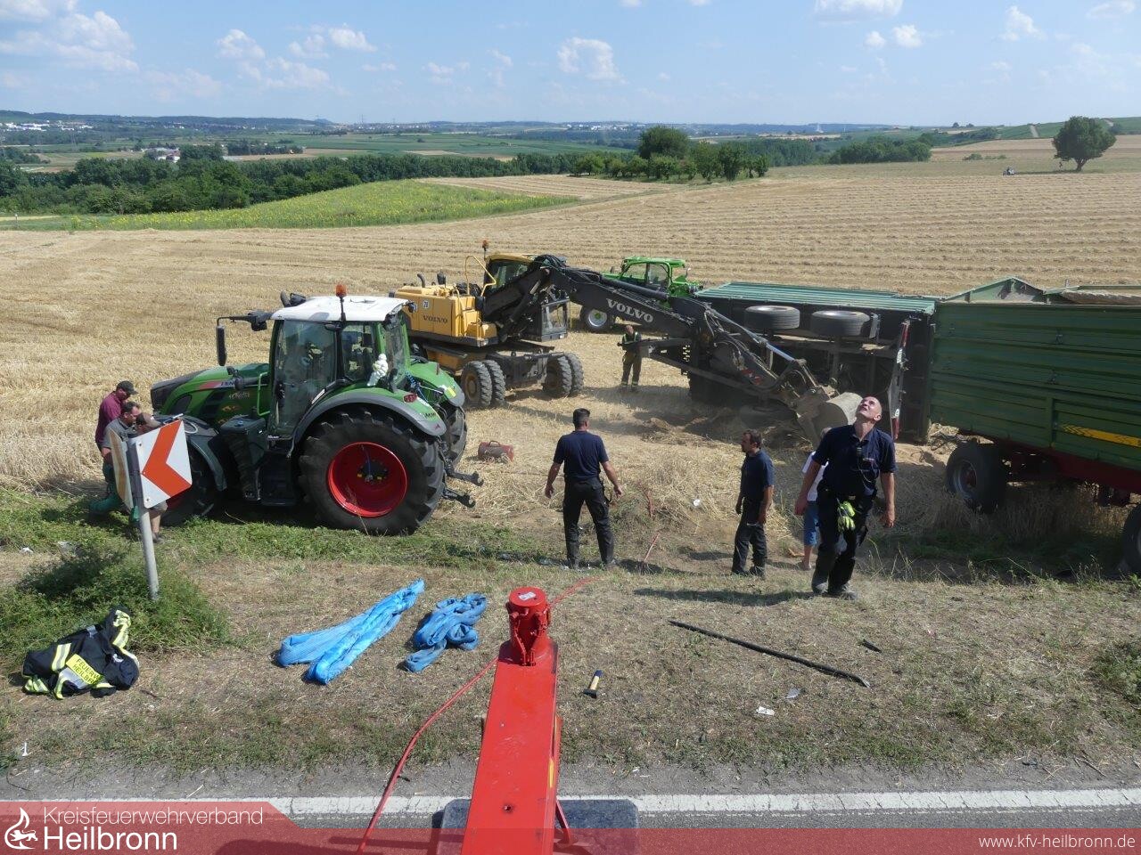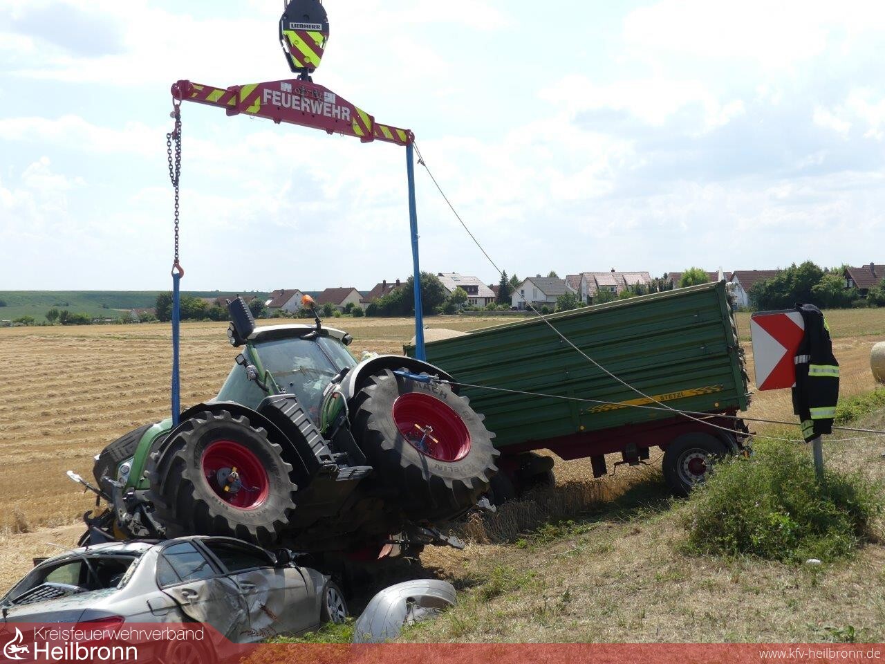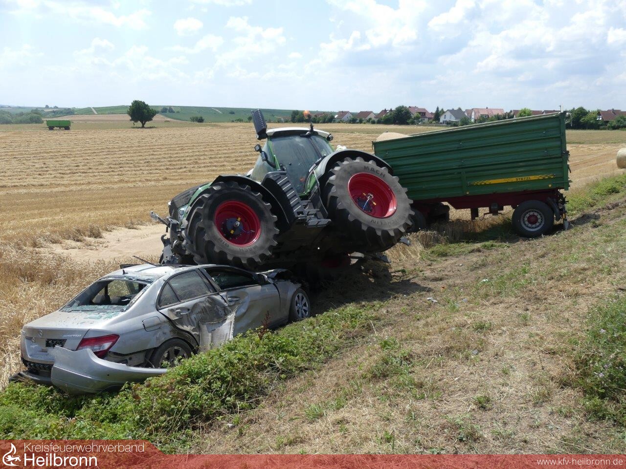 Die Unfallverursacherin wurde bei dem Zusammenstoß in den Gegenverkehr abgewiesen. Hierbei geriet der Mercedes unter die Räder eines entgegen kommenden Traktorgespannes mit zwei Anhängern.