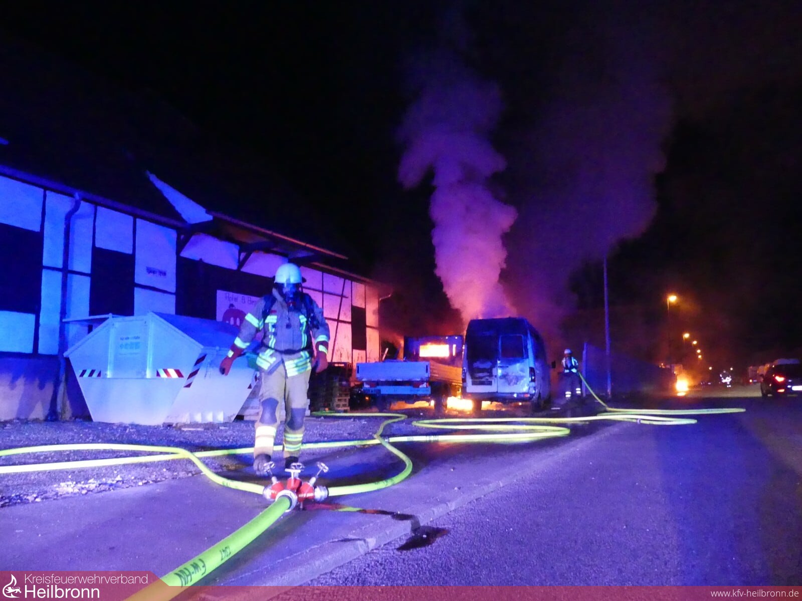 Augenzeugen hatten zwei brennende Fahrzeuge vor einer Lagerhalle in der Böllinger Straße bemerkt.