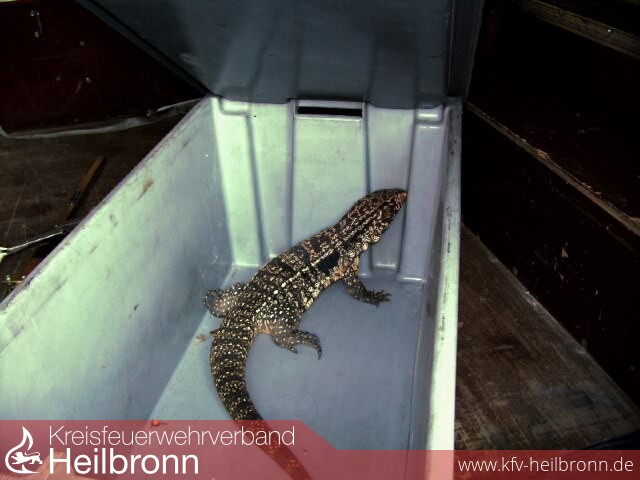 Mit Unterstützung eines vorsorglich mit Tierfanggeräten angeforderten Feuerwehrmannes der Feuerwehrwehr Heilbronn wurde der Waran, welcher sich unter einen Erker des Hauses verkrochen hatte, gefangen und in ein Behältnis verbracht.