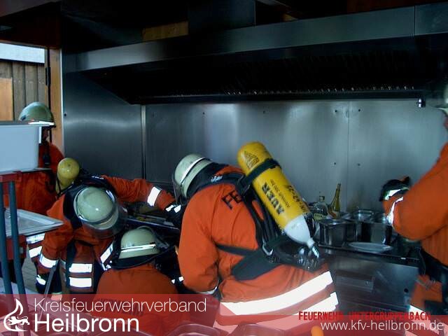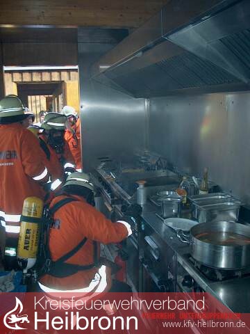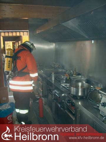 In einem Biergarten entzündete sich das Fett des Grills in der Küche. Die Angestellten des Biergartens nahmen Erstmaßnahmen mittels einer Löschdecke vor. Die eintreffende Feuerwehr löschte dann den Brand mit einem Kohlendioxid-Löscher und einer Löschdecke.