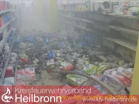 In einem Verkaufsraum eines Lebensmitteldiscounter in Ellhofen ging, vermutlich durch Brandstiftung, eine Regalhälfte mit Toilettenpapier in Flammen auf. Trotz erster Löschversuche durch das Personal breitete sich der Brand auf den Rest des Regals aus und verursachte eine sehr starke Rauchentwicklung. Das Personal führte eine vorbildliche Evakuierung aller Personen aus dem Markt durch.