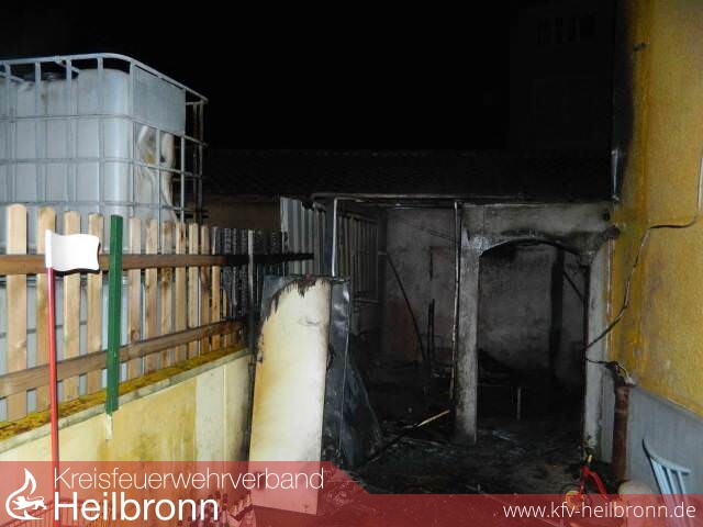Das Feuer hatte sich bereits auf das Holzdach sowie auf die Polstermöbel des Anbaues ausgebreitet. Auch mehrere Kunststoffbehälter auf dem Nachbargelände waren durch die Hitzestrahlung der meterhohen Flammen teilweise geschmolzen. Hierdurch kam es zu Austritten von Restmengen eines brennbaren Färbemittels aus den Behältern, was die Intensität des Feuers noch verstärkte.