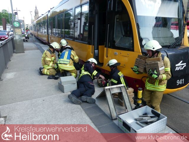 Für die Rettung des Schwerverletzten mussten die Einsatzkräfte einen Teil der Stadtbahn anheben. Hierzu kam ein spezieller Hebesatz mit verschiedenen hydraulischen Gerätschaften sowie umfangreichem Unterbaumaterial zum Einsatz.