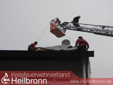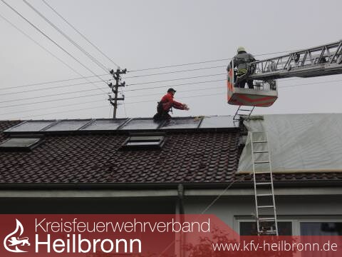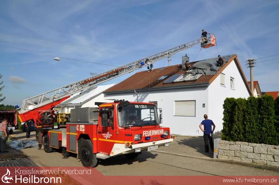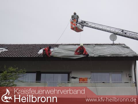 Die Einsatzkräfte der Feuerwehr, gesichert durch den Einsatz der Drehleiter, mussten überwiegend die kompletten Dachflächen der Häuser mit Folie abdecken und mit Dachlatten sichern.