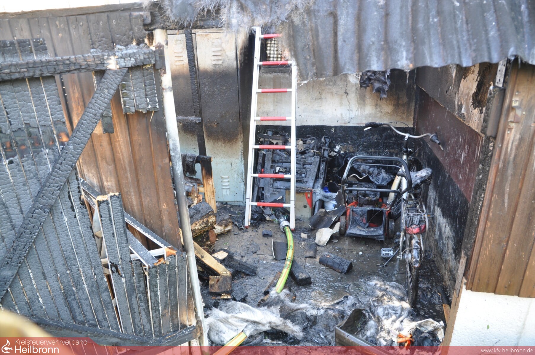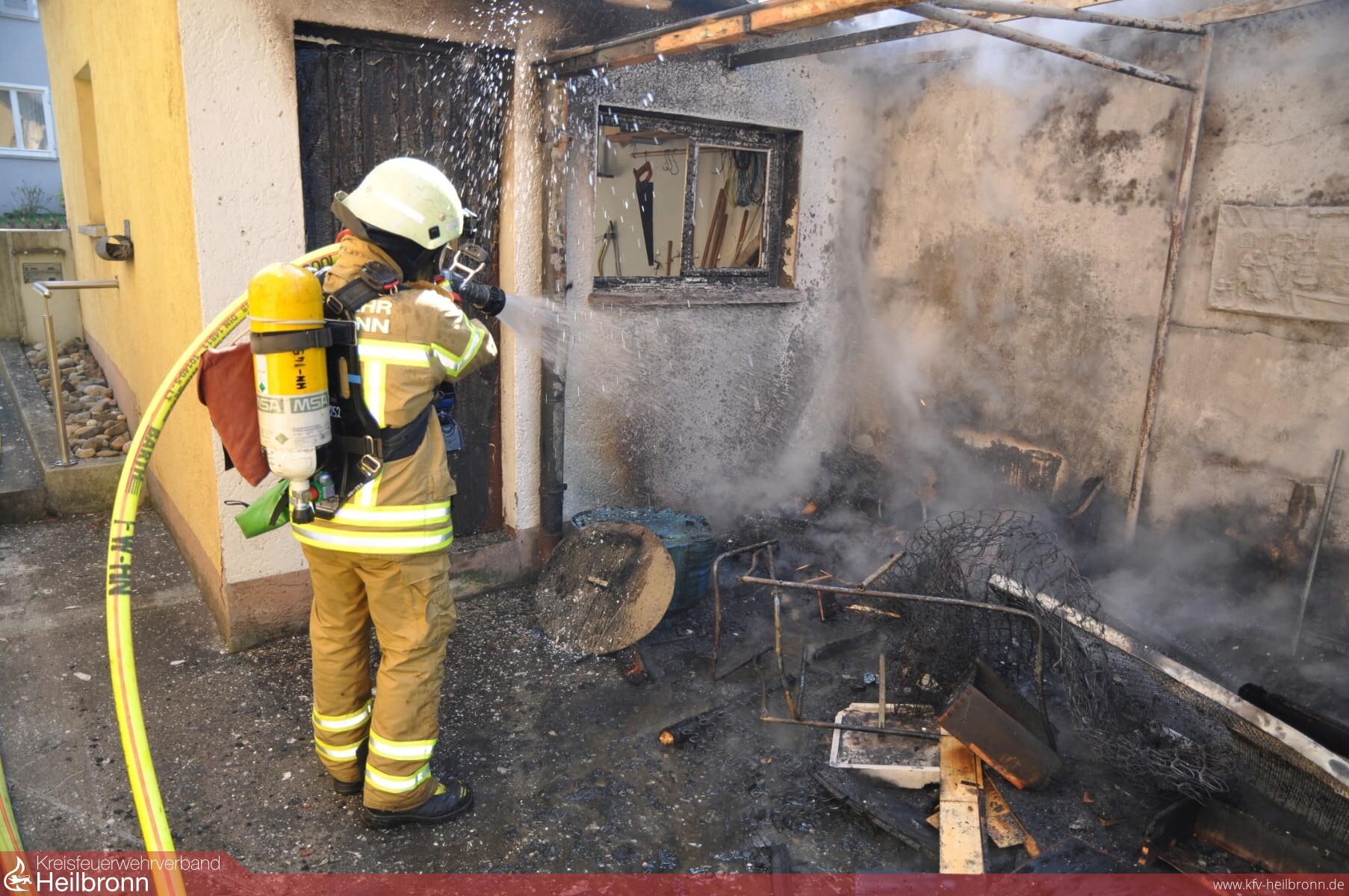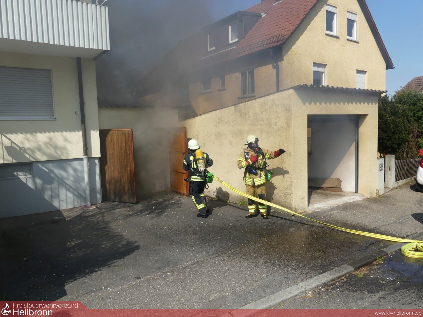 Beim Eintreffen brannte ein Garagenanbau in voller Ausdehnung. Die Flammen hatten bereits auf die Nachbargarage übergegriffen. Auch die Fensterscheiben der angrenzenden Wohngebäude waren bereits gesprungen.