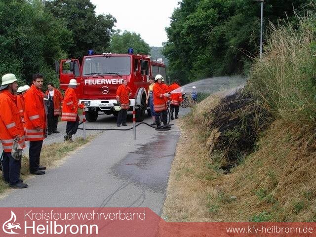 Entlang des Jagsttalradweges hatte sich einen Fläche von ca. acht auf zwei Meter entzündet. Das Feuer hatte sich rasch ausgebreitet und drohte auf ein größeres, gemähtes, Wiesenstück überzugreifen. Ein Autofahrerfahrer, der gerade mit zwei Fässern einen Wassertransport durchführte, stoppte seine Fahrt und begann mit den Löscharbeiten. Spaziergänger und einige Radfahrer unterstützten den PKW-Fahrer. Die starke Rauchentwicklung und der hohe Flammenschlag veranlasste, die im direkt benachbarten Wohngebiet lebenden Anwohner, die Feuerwehr zu alarmieren.