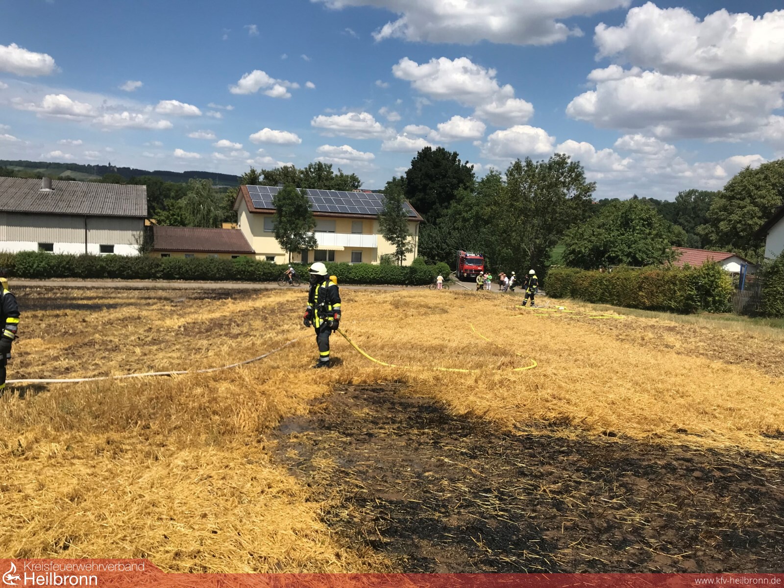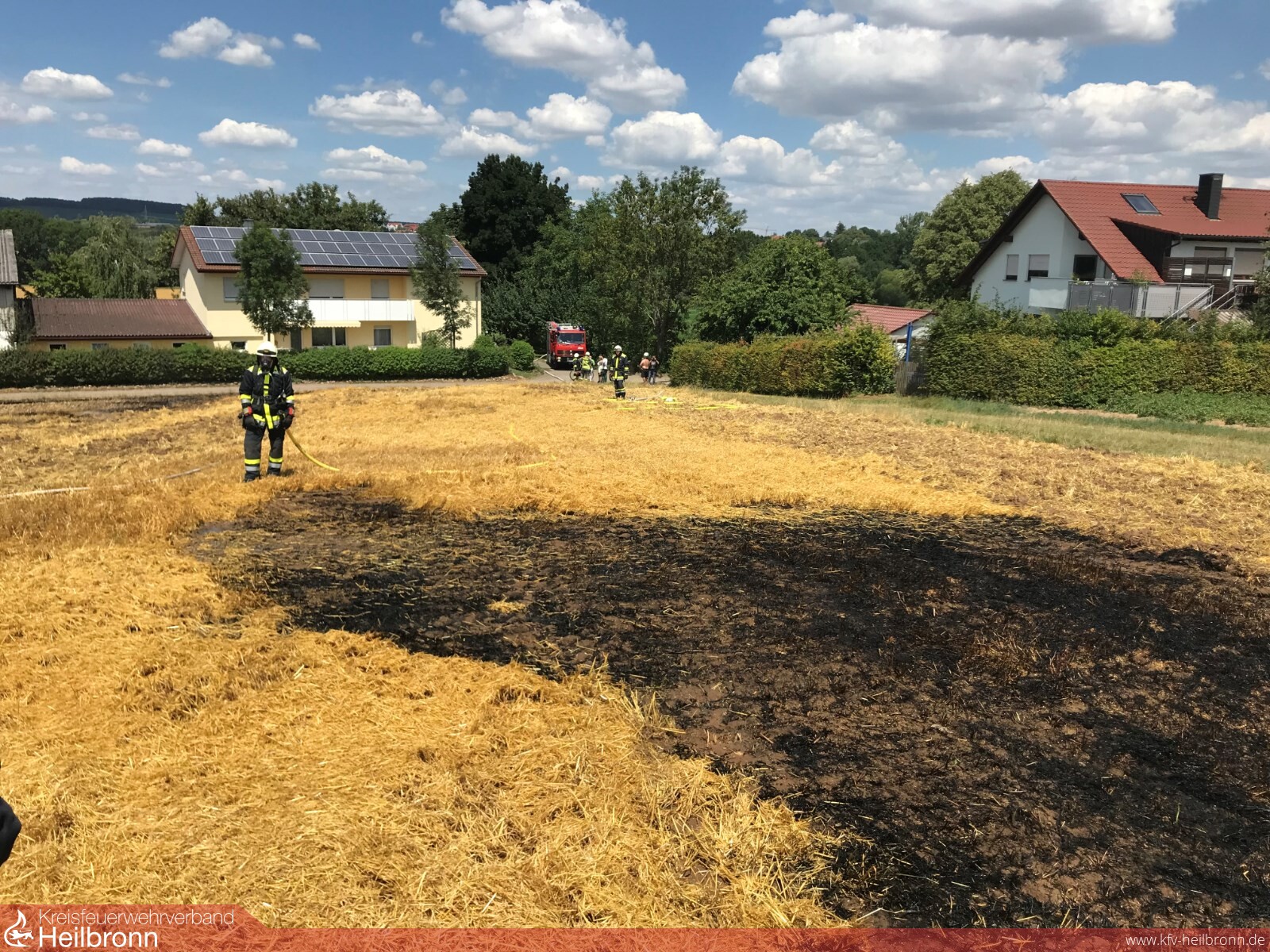 Beim eintreffen der ersten Kräfte waren die angrenzenden Eigentümer der Aussiedlerhöfe bereits dabei, ein Ausbreiten des Feuers mit einem mit Wasser gefüllten Vakuumfass zu unterbinden, außerdem kam ein Grubber zum Einsatz um die Stoppeln umzugraben. Von den Feuerwehren konnte somit mittels 3 C- Rohren die brennende Fläche relativ schnell abgelöscht werden. Anschließend wurde auch die abgebrannte Stoppelfläche untergegrubbert. Eine Polizeistreife war ebenfalls vor Ort, die Brandursache ist bisher unklar.