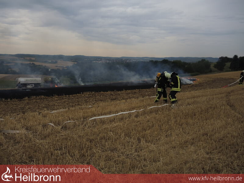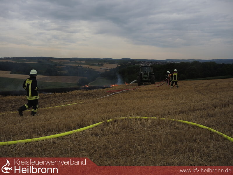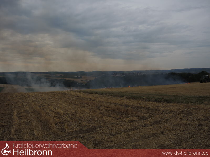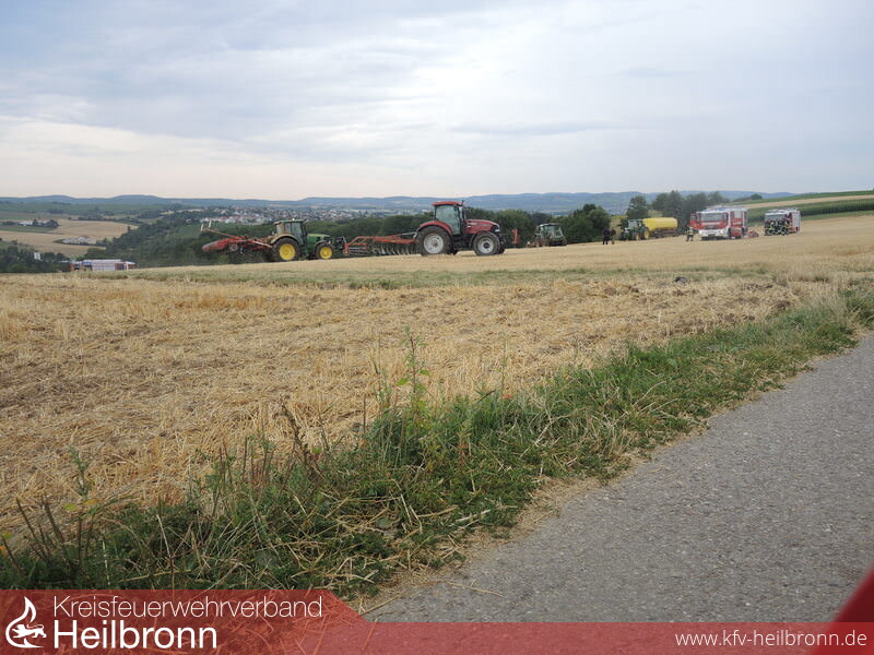 Die Feuerwehr Ilsfeld wurde mit der Gefahrenabwehrstufe 1 (GAS1) zu einem Flächenbrand auf einen Acker im Gewann Hasenweide alarmiert. Da in dieser Gegend kein Wasser verfügbar ist wurde sofort auf GAS2 erhöht und auch noch der Löschzug Schozach mitalarmiert. Aufgrund des vorbildlichen und schnellen Handelns einiger Landwirte die mit insgesamt fünf Schleppern (mit drei Grubbern und zwei Wasserfässer) zur Einsatzstelle fuhren, konnte der Brand sehr schnell eingedämmt und abgelöscht werden.