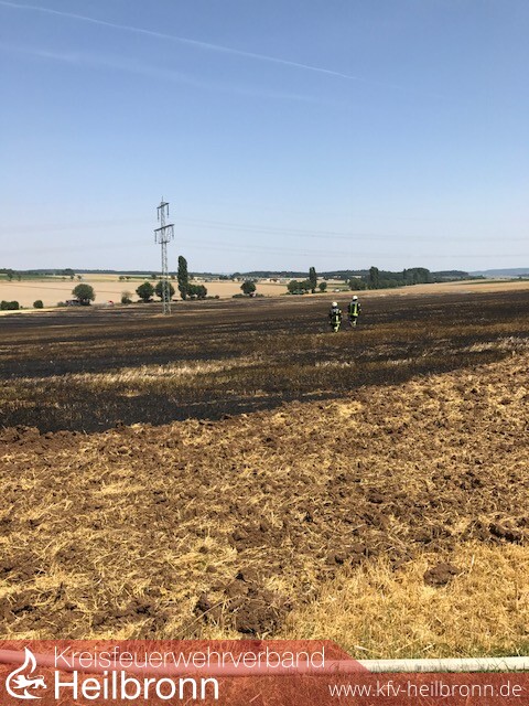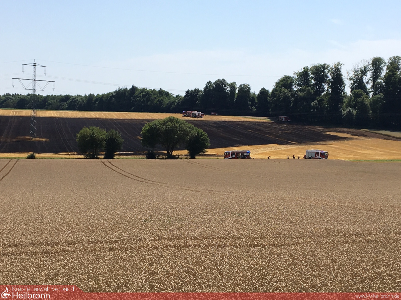 Um 13.38 Uhr wurde der Integrierten Leitstelle ein Brand auf einem Getreidefeld nahe der Bundesstraße 39 zwischen Kirchhausen und Fürfeld gemeldet.