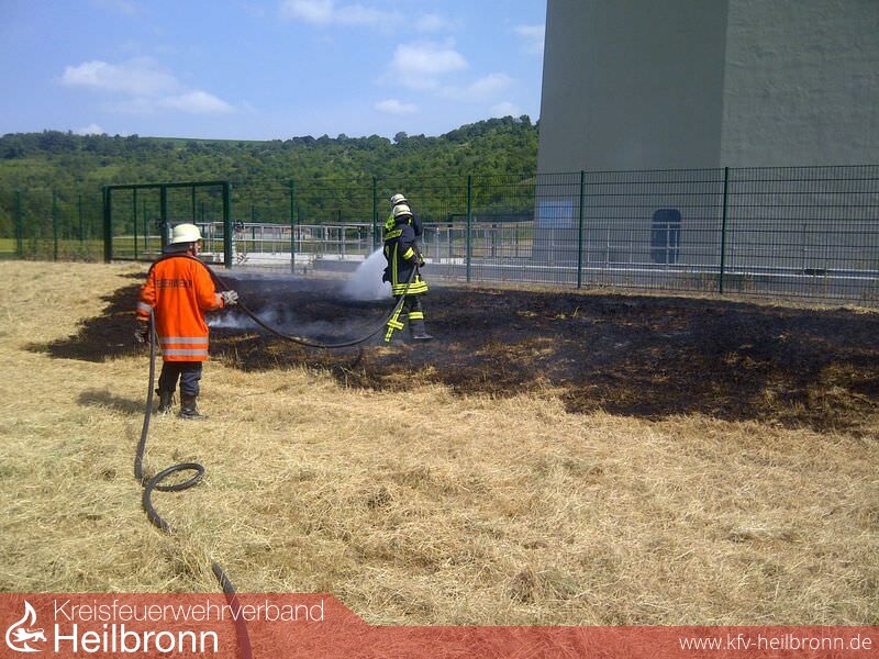 Unterhalb der Autobahnbrücke neben dem Regenrückhaltebecken war die Wiese in Brand geraten. Durch die Bauarbeiten die zur Zeit auf der Jagsttalbrücke stattfinden kam es höchstwarscheinlich zu einem Funkenflug, der die daruntreliegende Wiese auf einer Fläche von ca. 50 m² entzündete. Der Flächenbrand wurde mit dem Schnellangriff gelöscht.
