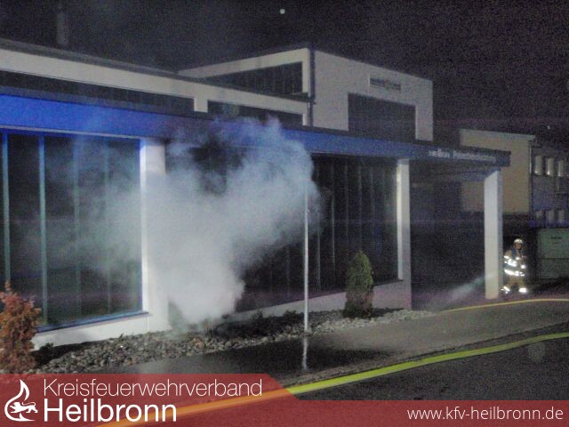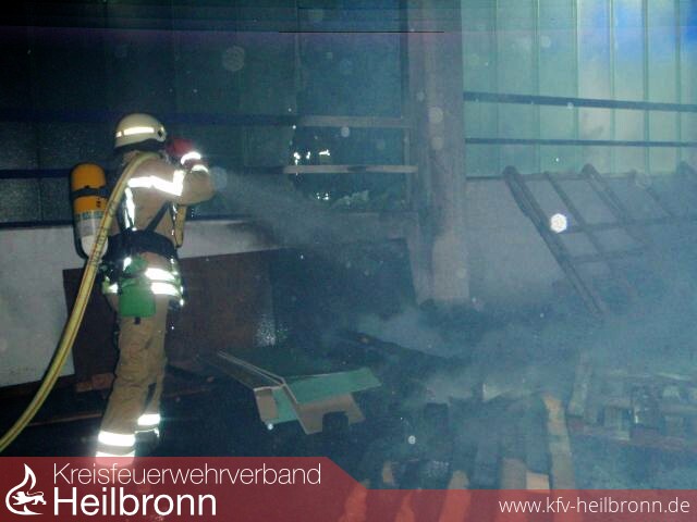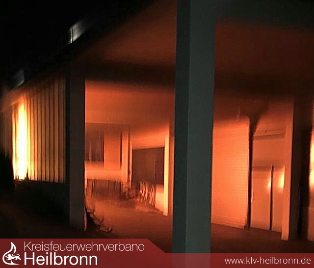 Beim Eintreffen vor Ort schlugen ca. drei Meter hohe Flammen aus dem Fenster eines Hallenanbaus.