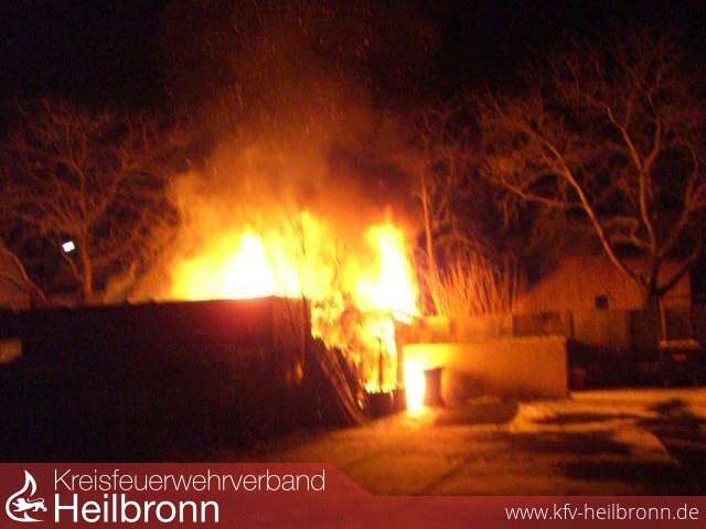 In der Nacht zum Dienstag brannte an der Furtstraße in Untergriesheim die Überdachung eines Baustofflagers und das untergestellte Schalmaterial. Der Brand griff auch auf einen abgetrennten Raum, in welchem neben Geräten auch eine Gasflasche gelagert war, über. Während des Brandverlaufes blies diese infolge Erhitzung und Überdruck ab.