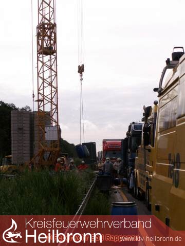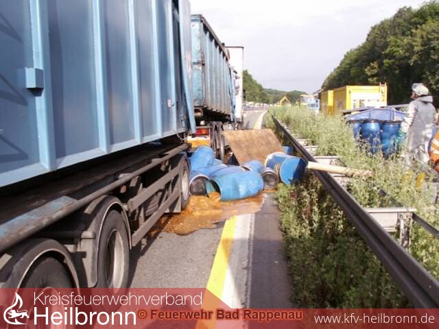 Im Baustellenbereich zwischen den Anschlussstellen Bad Rappenau und Sinsheim-Steinsfurt war ein LKW aus unbekannter Ursache auf einen vorausfahrenden Sattelzug aufgefahren. In Folge eines Auffahrunfalles waren mehrere Dutzend Fässer vom Anhänger des auffahrenden LKW auf die Autobahn gestürzt und Leck geschlagen.
