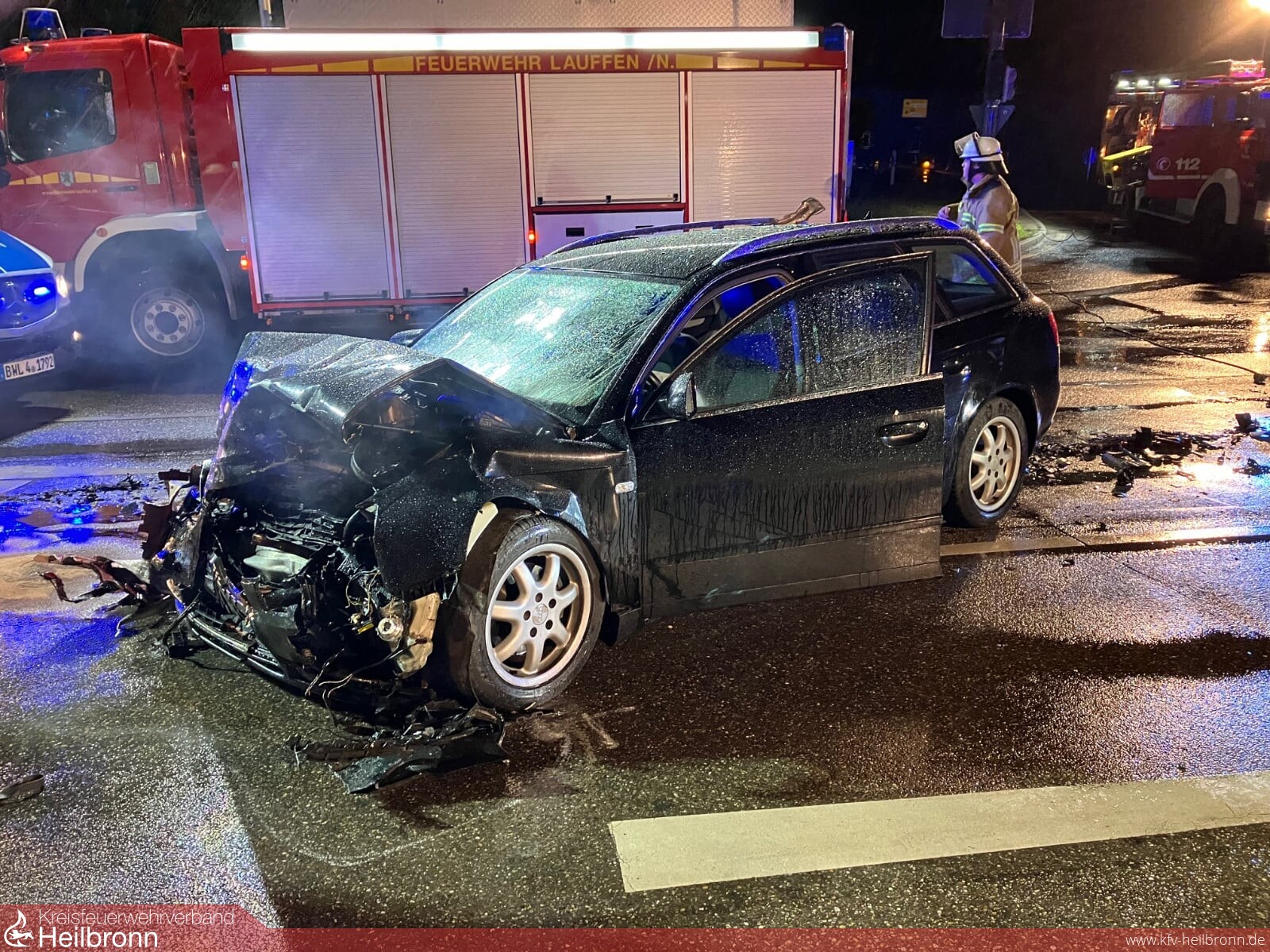 Am Übergang der B27 auf die Neckartalstraße an der Abzweigung nach Flein kam es zu einem Frontalunfall zwischen 2 PKW. Der Fahrer des schwarzen Audi konnte sich selbst aus seinem PKW befreien und wurde sofort durch den nahezu zeitgleich eintreffenden Rettungsdienst versorgt.