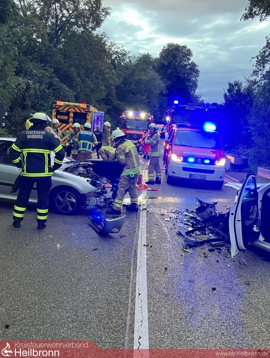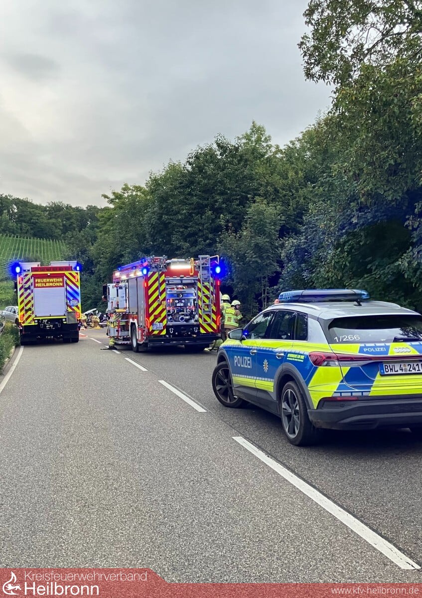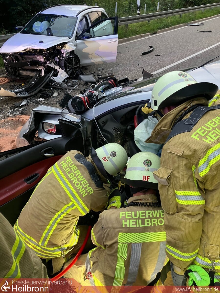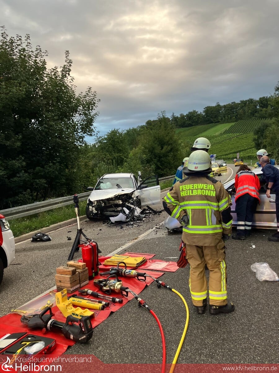 Am heutigen Donnerstag kam es kurz vor 7 Uhr zu einem Verkehrsunfall auf der B 39 in Fahrtrichtung Weinsberg. Zwei Fahrzeuge waren in einer langgezogenen Kurve kurz nach Ortsausgang Heilbronn frontal zusammengestoßen. Hierbei wurde eine Person im Fahrzeug eingeklemmt und musste von der Feuerwehr mit technischen Rettungsgeräten befreit werden. Eine weitere, am Unfall beteiligte Person erlitt leichte Verletzungen.