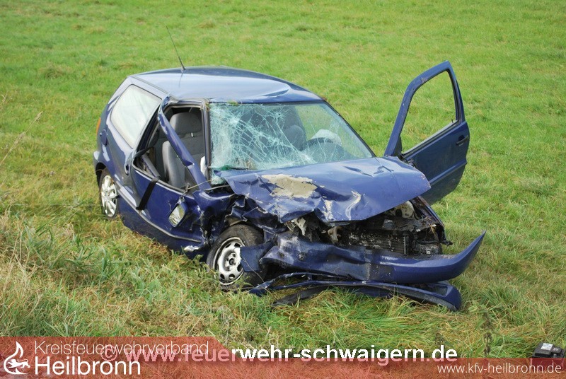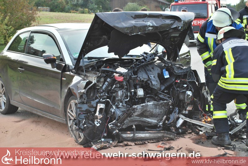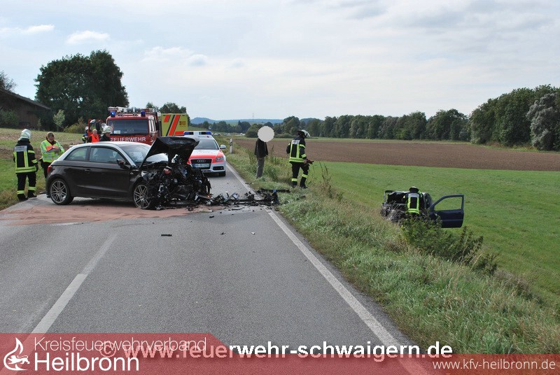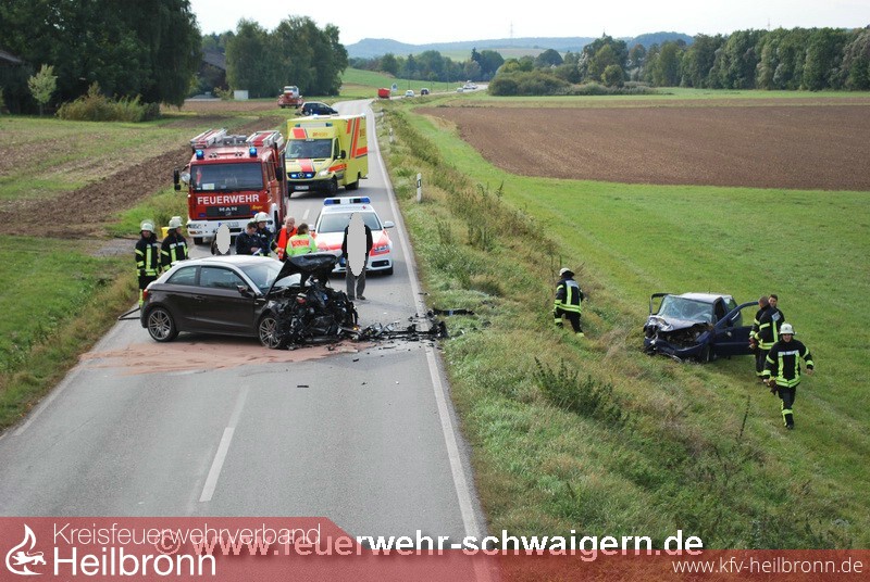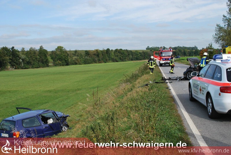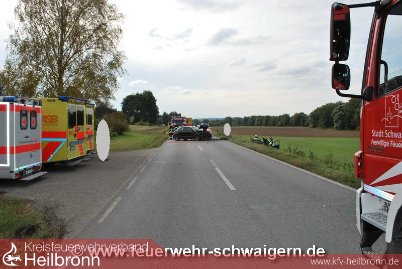 Auf der K2160 zwischen Schwaigern und Stetten a.H. waren zwei PKW frontal zusammengestoßen. Personen waren nicht eingeklemmt, jedoch waren alle drei Fahrzeuginsassen schwer verletzt.