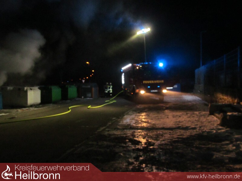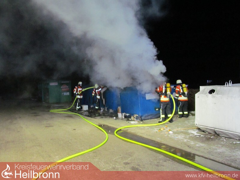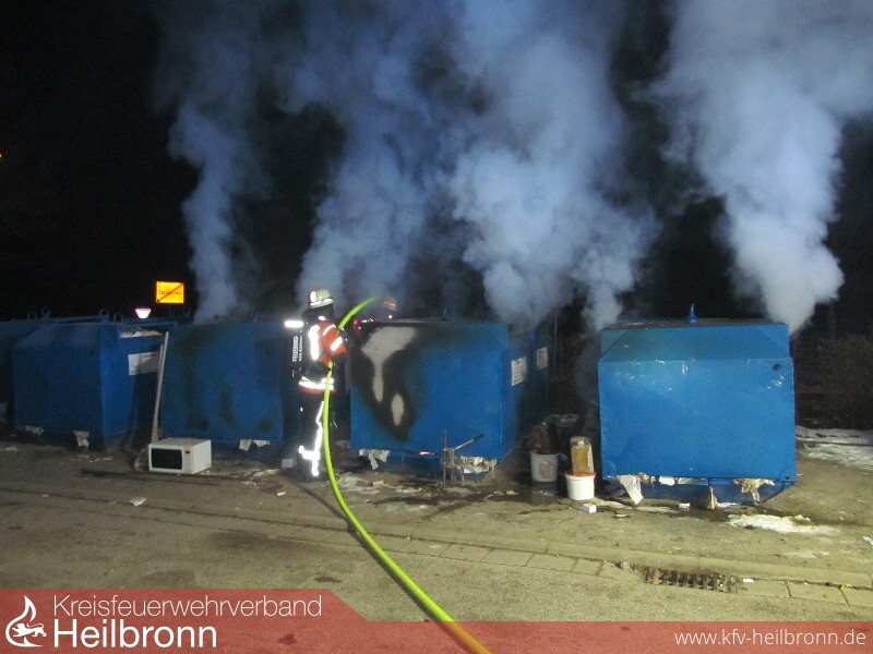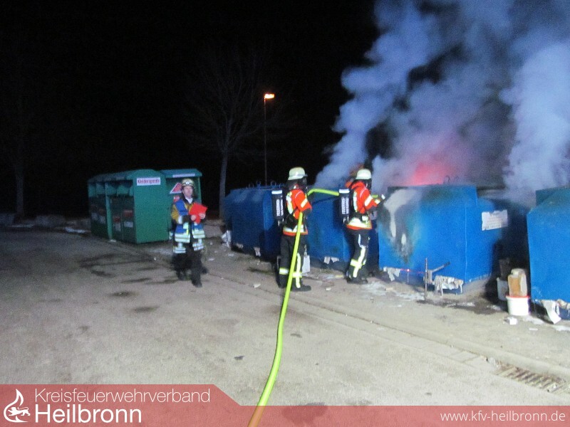 Mit dem Alarmstichwort „Kleinbrand“ wurde die Freiwillige Feuerwehr Bad Rappenau am späten Samstagabend um 22:25 Uhr alarmiert. Schon auf der Anfahrt war eine starke Rauchentwicklung zu erkennen. Beim Eintreffen der Einsatzkräfte standen fünf Altpapiercontainer im Vollbrand. Der Angriffstrupp des ersteintreffenden Fahrzeugs nahm sofort unter PA eine Schaumpistole zur Brandbekämpfung vor. Die Besatzung baute zudem eine Wasserversorgung auf. Das zweite Löschfahrzeug stellte den zweiten Angriffstrupp, welcher unter PA einen Löschangriff mit einem C-Strahlrohr vornahm. Zudem sicherte die Besatzung des zweiten Löschfahrzeuges die Einsatzstelle ab. Um zu verhindern, dass Glätte durch das Löschwasser entsteht, streute die Feuerwehr die Einsatzstelle im Nachgang ab. Die Feuerwehr Bad Rappenau war mit 3 Fahrzeugen und 18 Mann im Einsatz.