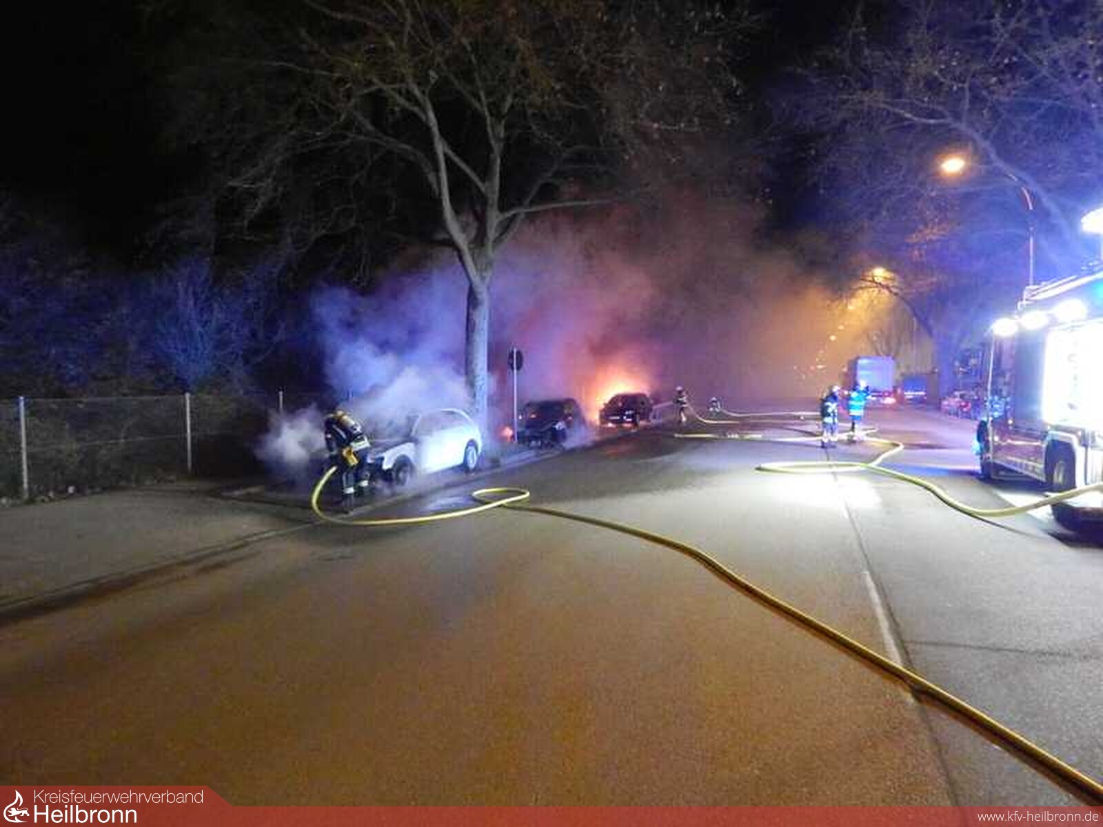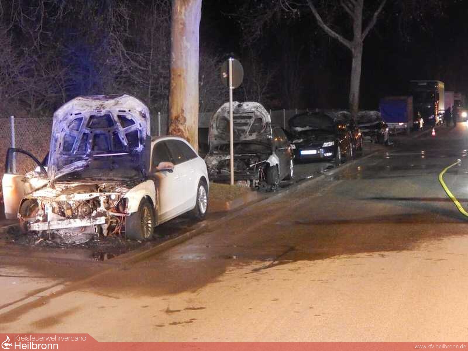Vor Ort brannten fünf teilweise hochwertige Fahrzeuge, welche hintereinander auf den Parkflächen abgestellt waren.