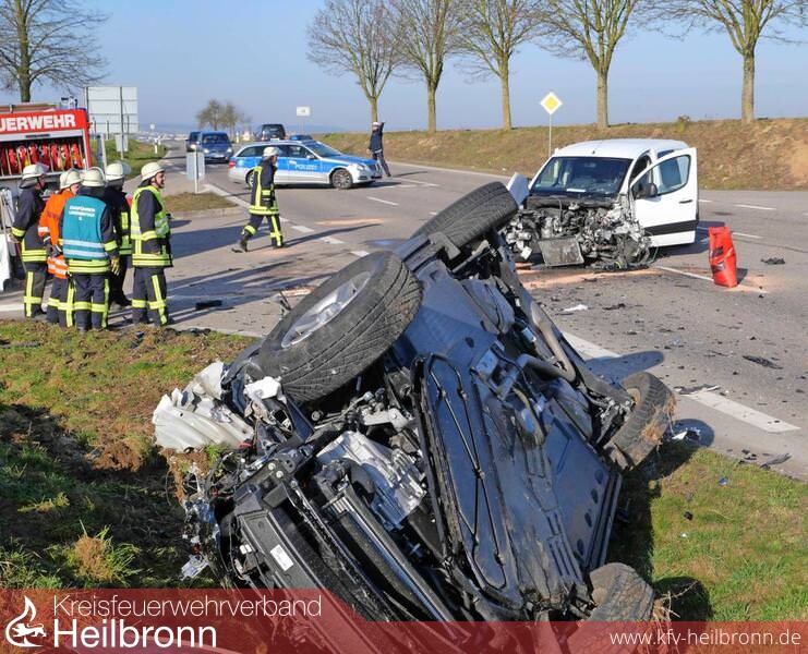 Gegen 8:30 Uhr fuhr ein 43-Jähriger von Öhringen in Richtung Neuenstadt. An der Kreuzung mit der Straße, die von Langenbeutingen nach Baumerlenbach führt wollte er mit seinem Citroen Berlingo nach links in Richtung Langenbeutingen abbiegen und übersah hierbei offensichtlich einen entgegen kommenden, mit vier Erwachsenen besetzten VW Tiguan. Der VW wurde durch die Wucht des Aufpralls nach rechts von der Fahrbahn abgewiesen und blieb auf dem Dach im Straßengraben liegen. Der Citroenfahrer sowie ein Mitfahrer im Tiguanerlitten mittelschwere Verletzungen und wurden vom Rettungsdienst abtransportiert. Die 38 Jahre alte Fahrerin des VW und zwei männliche Insassen ihres Wagens wurden mit leichteren Verletzungen ins Krankenhaus gebracht.