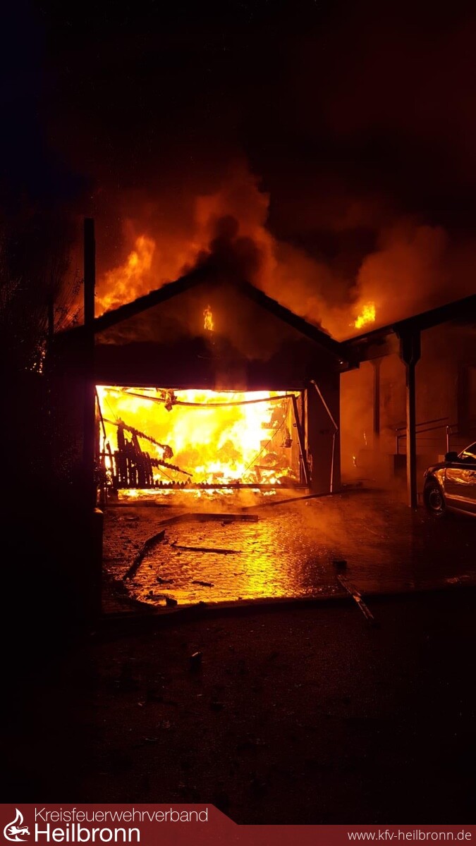 Am gestrigen Nachmittag gegen 16:30 wurde die Feuerwehr Gundelsheim und Bad Friedrichshall zu einem Gebäudebrand alarmiert. Beim Eintreffen der ersten Kräfte stand eine Garage im Vollbrand und man konnte Explosionen wahrnehmen. Der Brand hatte bereits auf das Dach des Wohnhauses übergegriffen. Schnell wurde mit den Löscharbeiten an der Garage begonnen und parallel dazu wurden mehrere Riegelstellungen aufgebaut, um ein Übergreifen der Flammen auf angrenzende Gebäude zu vermeiden. Die Drehleiter aus Bad Friedrichshall wurde bei Ankunft an der Garage positioniert, um die Garage von oben zu löschen. Als das Feuer gelöscht war, wurde die komplett zerstörte Garage mit Schaummittel benetzt, um eine Wiederentfachung des Feuers zu verhindern.