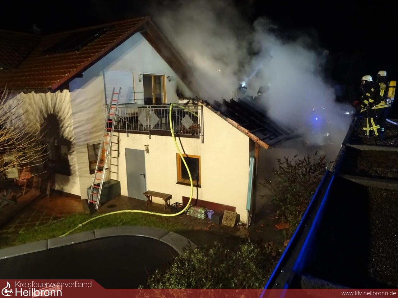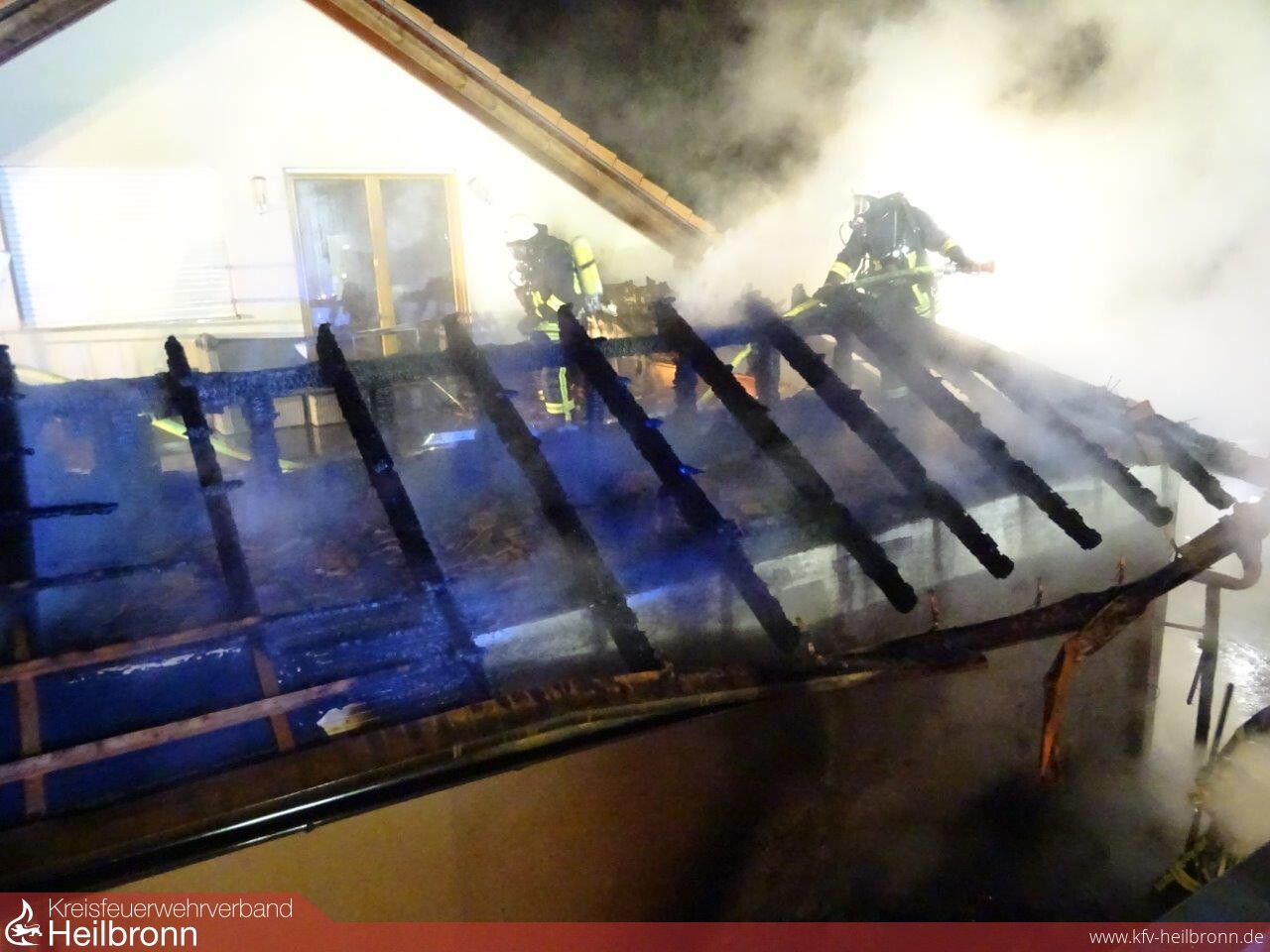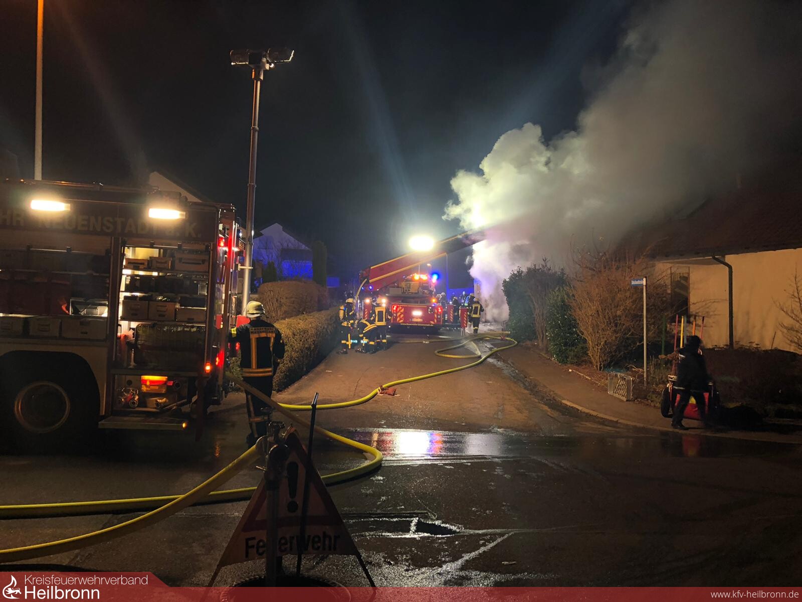 Laut Polizeibericht entfachte sich das Feuer nach bisherigen Ermittlungen durch ausgeleerte Aschereste. Flammen griffen auf das dort gelagerte Holz über und setzten die Balken der Dacheinfassung in Brand. „Durch offensiven Kräfteeinsatz konnten wir ein Übergreifen des Feuers auf das Wohnhaus verhindern“ sagt Hartmut Schaffroth, Kommandant der Feuerwehr Neuenstadt. Man habe das Feuer durch massiven Einsatz von allen Seiten eingekreist und bekämpft. Drei Kinder und zwei Erwachsene, die im Haus wohnen, seien von der Feuerwehr geweckt worden. Sie seien bei Nachbarn untergekommen „Wenn wir fünf Minuten später alarmiert worden wären, hätten die Flammen auf das Wohnhaus übergegriffen.“ Zur Brandbekämpfung waren die Feuerwehren aus Neuenstadt, Cleversulzbach und Stein/Kochertürn mit sieben Fahrzeugen und etwa 50 Einsatzkräften und der Rettungsdienst aus Neuenstadt vor Ort.