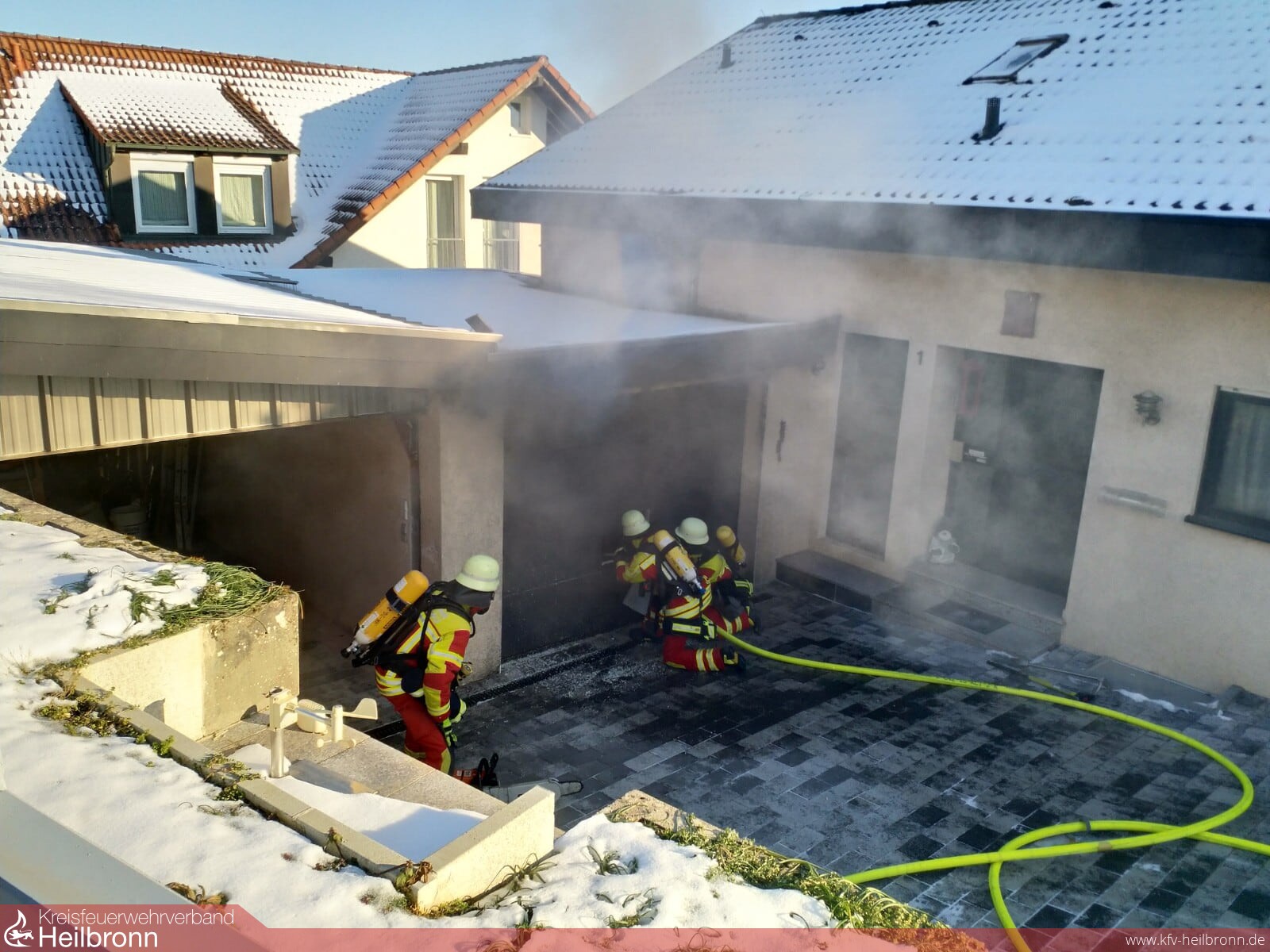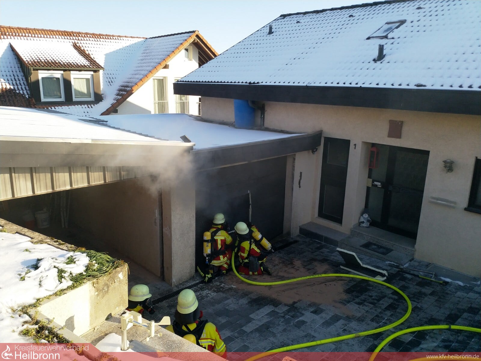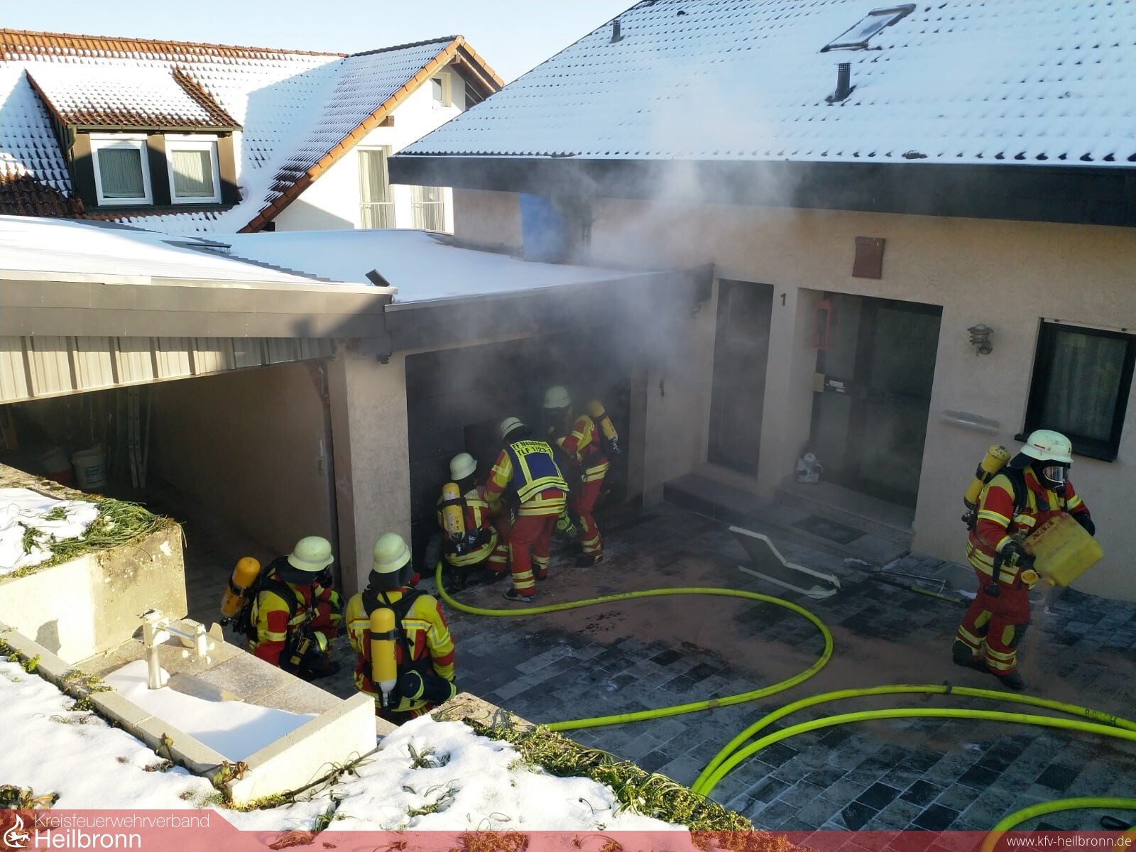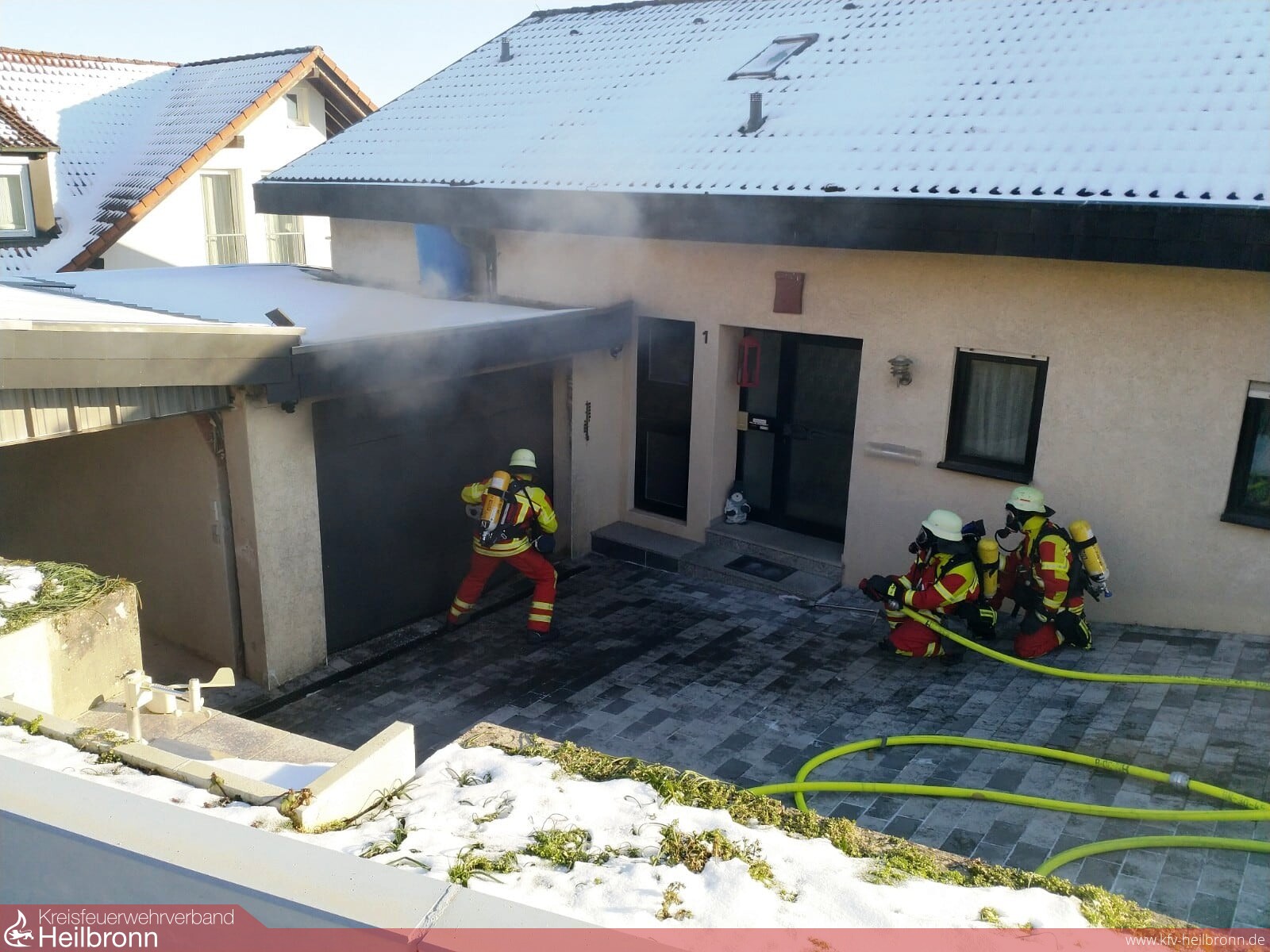 Mit Stichwort „Zimmerbrand“ alarmierte die Integrierte Leitstelle Heilbronn (ILS HN) die Einsatzabteilungen (EA) Neudenau und Herbolzheim. Vor Ort wurde Rauchentwicklung aus einer Garage festgestellt. Der Besitzer war vor Ort und gab gegenüber den Einsatzkräften an, dass sich in der Garage ein Propangasflasche befindet, welche mit einem Heizstrahler in Betrieb war. Bandbedingt hatte sich das Garagentor geschlossen und ließ sich auch nicht mehr öffnen, so dass sich die vorgehenden Trupps des Tanklöschfahrzeuges (TLF 16/25) und des Löschgruppenfahrzeuges (LF 10/6) mit der Rettungssäge gewaltsam Zugang zum Innern der Garage verschaffen mussten. Nach einer ersten Öffnung wurden die Flammen mit einem C-Rohr abgelöscht und der Innenraum mit der Wärmebildkamera überprüft.