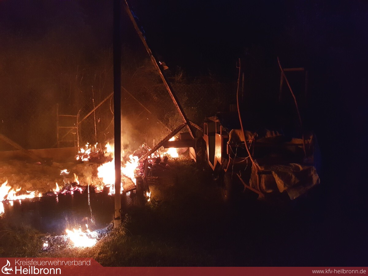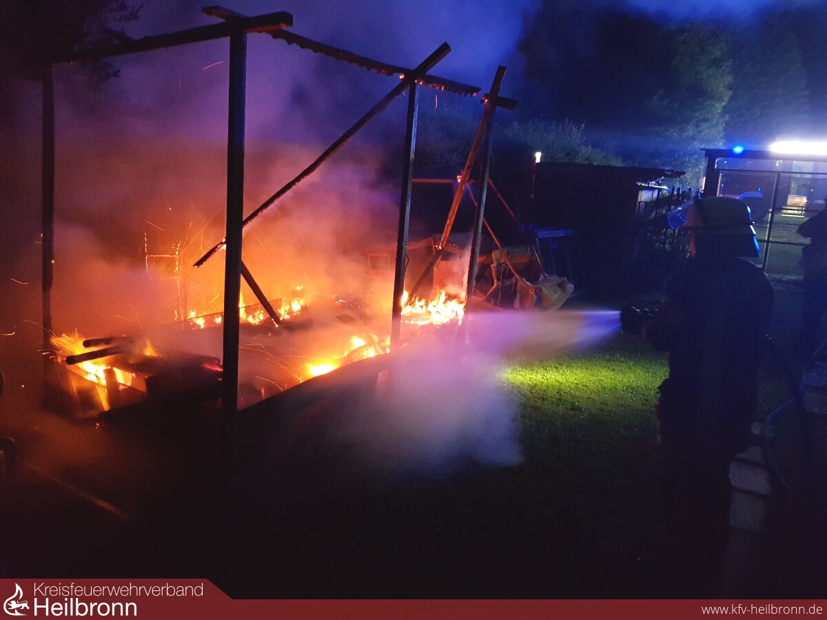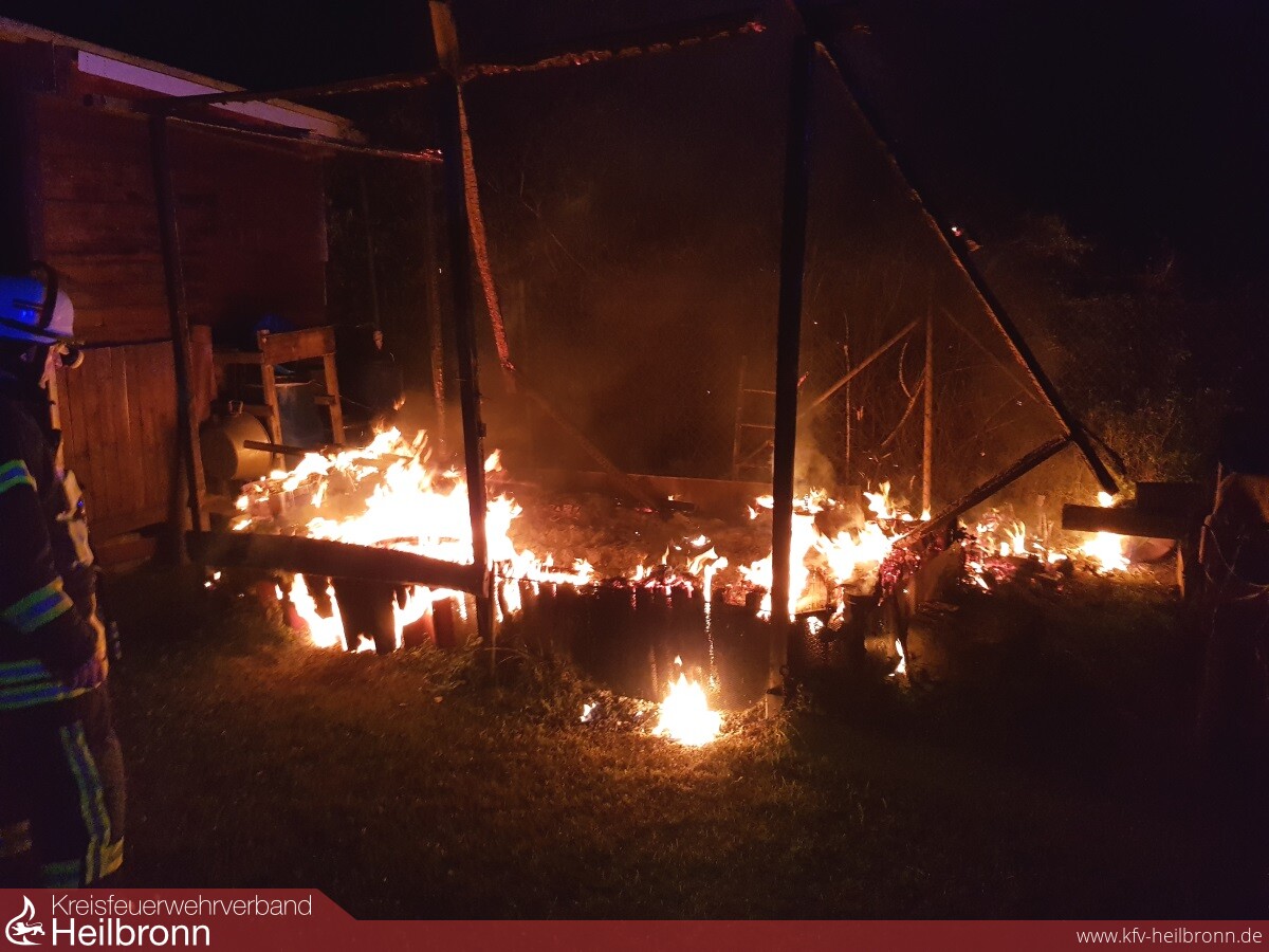 Durch Beamte des Polizeirevier Lauffen a.N. wurde bei einer Vorbeifahrt auf der L1103 bemerkt, dass offensichtlich ein Gartenhäuschen im Bereich des „Lauerbrückle“ in Brand stand. Ein Vordringen auf das Grundstück, zur Einleitung erster Maßnahmen, war für die Polizei nicht möglich, da das Gartengrundstück von einem hohen Zaun mit Stacheldraht gesichert war.