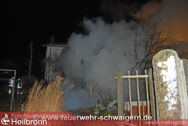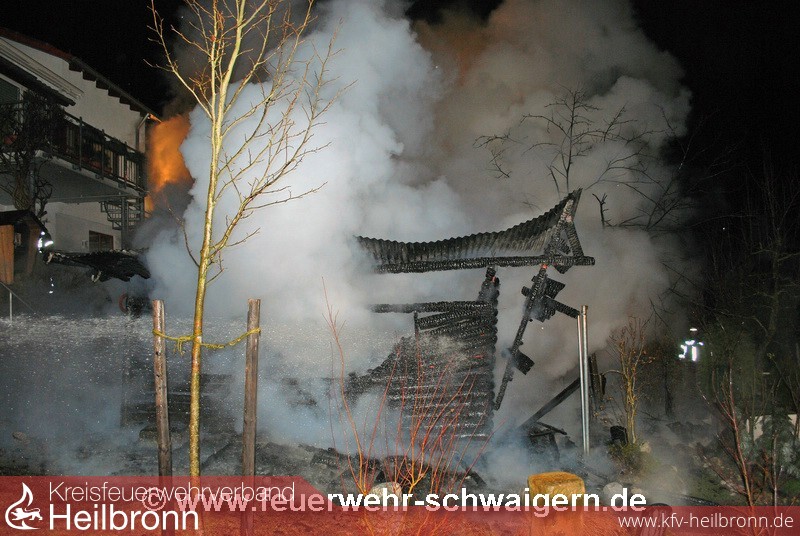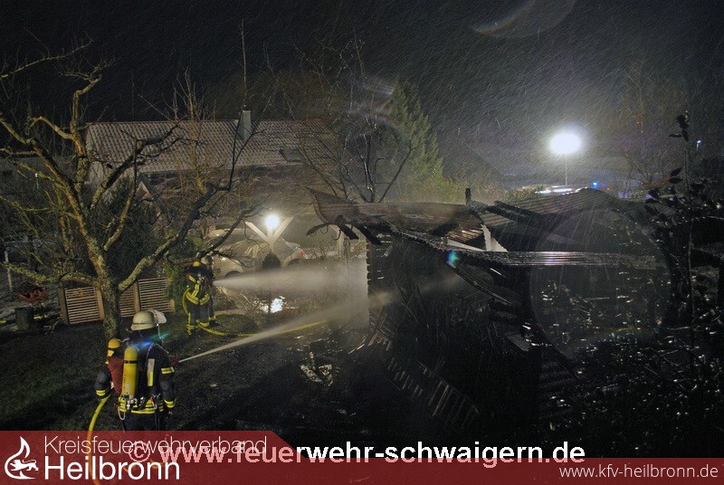 Der Feuerwehr wurde kurz vor 1 Uhr der Brand einer Gartenhütte in der Bahnhofstrasse im Stadtteil Stetten a.H. gemeldet. Beim Eintreffen der ersten Kräfte der Abteilung Stetten a.H. stelle sich heraus, dass die Gartenhütte im Vollbrand stand. Daher wurde umgehend die Alarmstufe erhöht und noch die Abteilungen Schwaigern und Niederhofen alarmiert. Erschwerend kam hinzu, dass das Gartenhaus nur wenige Meter neben dem Wohnhaus stand und der Eigentümer die Feuerwehr informierte, dass sich in dem Gebäude zwei Gasflaschen befinden.
