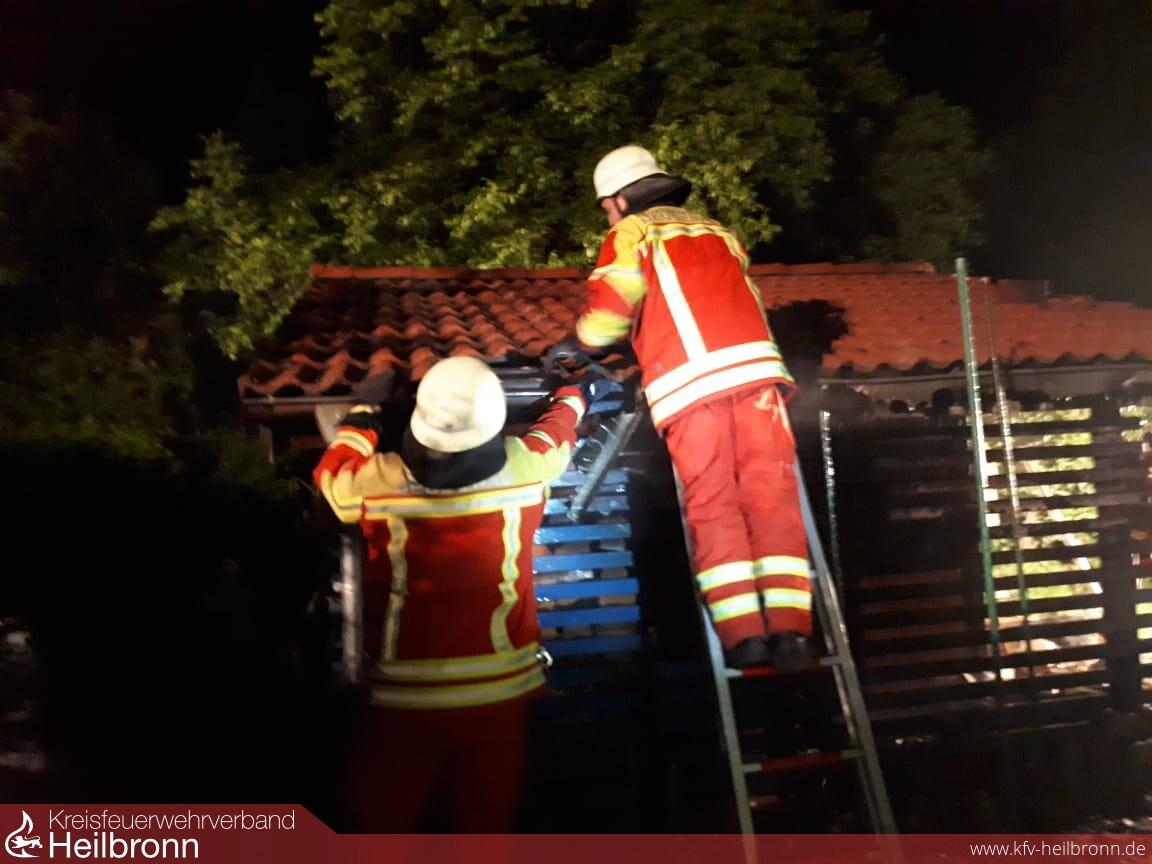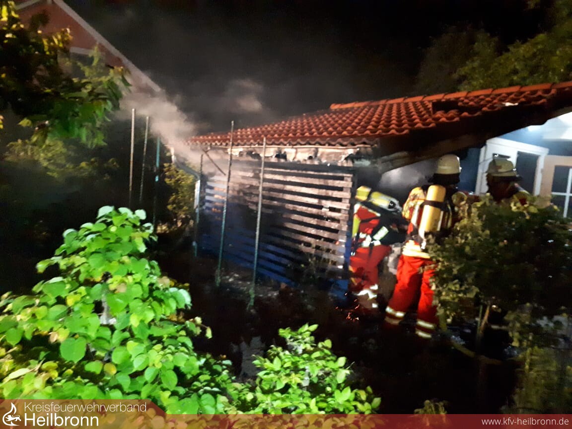 Zu einem brennenden Gartenhaus wurde die Einsatzabteilung Neudenau ins Wohngebiet Lottermann alarmiert. Die Hausbesitzer waren im benachbarten Wohnhaus selbst auf den Brand aufmerksam geworden, hatten den Notruf abgesetzt und mit dem Gartenschlauch eigene Löschversuche unternommen, bis die Feuerwehr da war.