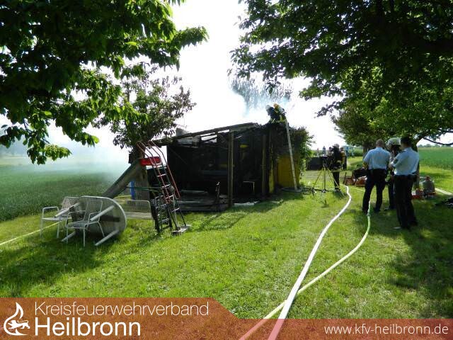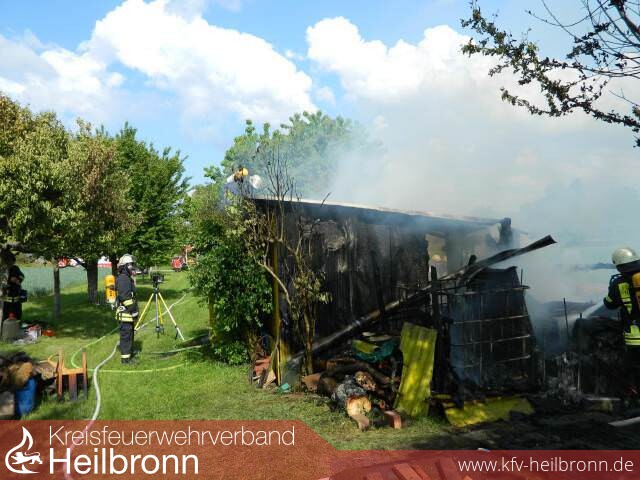 Gegen 16.15 Uhr meldeten Passanten der Integrierten Leitstelle eine brennende Gartenhütte in der Neipperger Straße. Als die Einsatzkräfte vor Ort eintrafen, brannte das Gartenhaus in voller Ausdehnung. Die hinzugekommenen Eigentümer wiesen den Einsatzleiter auf die in der Hütte gelagerten Gasflaschen hin. Diese konnten im Zuge der Löscharbeiten wenig später geborgen und gekühlt werden.