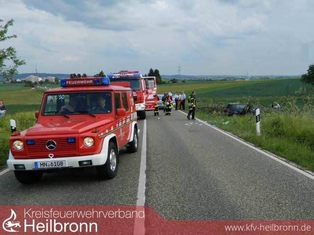Noch während die Löscharbeiten im Gange waren, ereignete sich auf der B 39 ein schwerer Verkehrsunfall. Ein 20-jähriger Autofahrer, welcher von Frankenbach in Richtung Kirchhausen unterwegs war, verlor auf gerader Strecke die Kontrolle über sein Fahrzeug. Er überquerte die Gegenfahrbahn und prallte frontal gegen einen Baum am Straßenrand.
