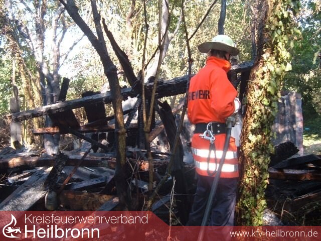 Das Feuer wurde daraufhin zunächst von zwei Seiten mit dem Schnellangriffsschlauch sowie einem C-Rohr eingedämmt, wobei ein Trupp unter Atemschutz vorging. Auf Grund des Ausmaßes des Brandes war die Stabilität der Hütte nicht mehr gewährleistet, so dass nach dem groben Ablöschen die Außenverkleidungen entfernt und vollends abgelöscht wurden. Danach brachte ein Trupp die Hütte kontrolliert zum Einsturz. Nach Beendigung der sich hinziehenden Nachlöscharbeiten konnte die Feuerwehr dann um 17:23 Uhr wieder Abrücken.