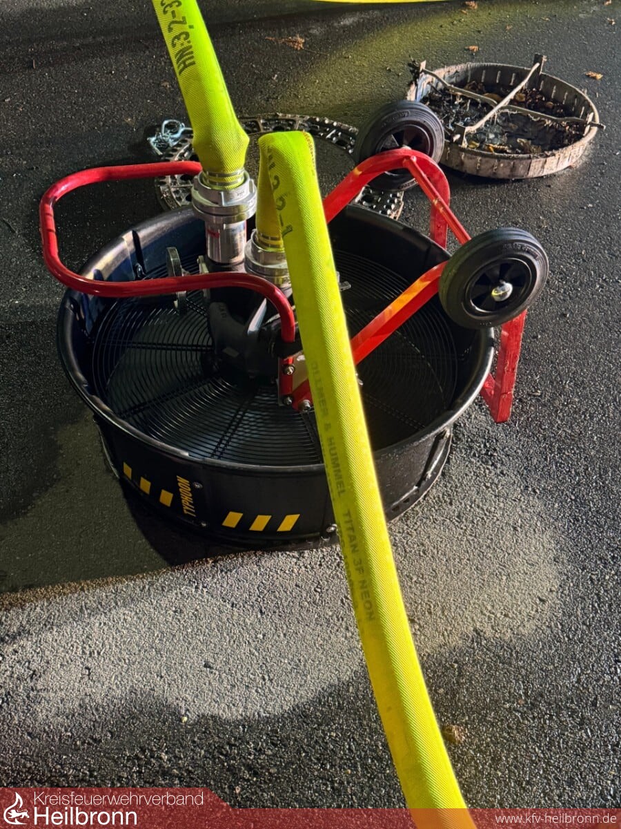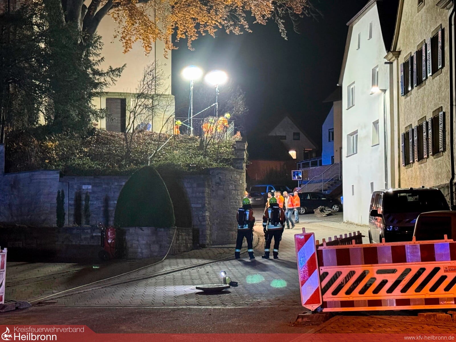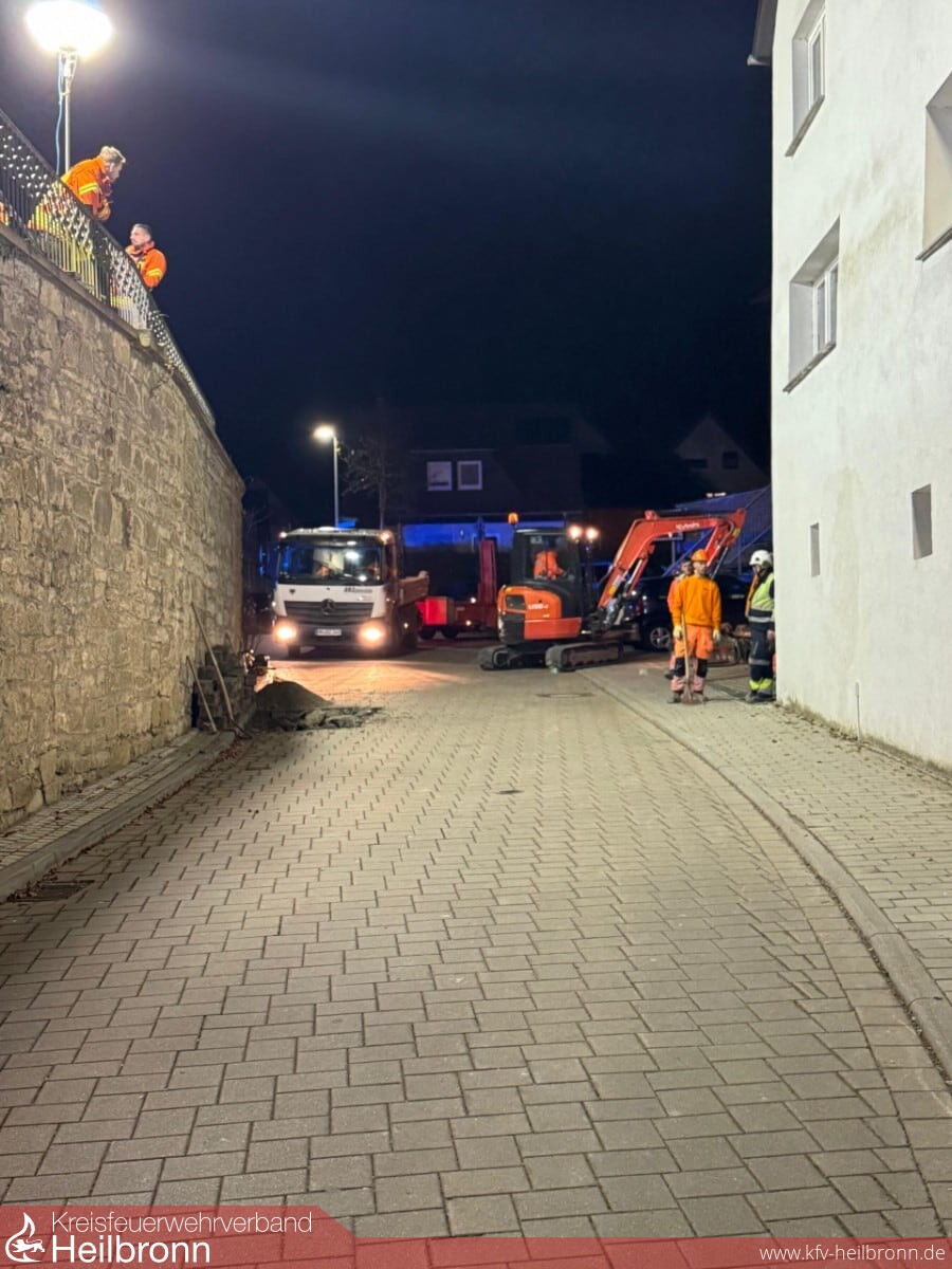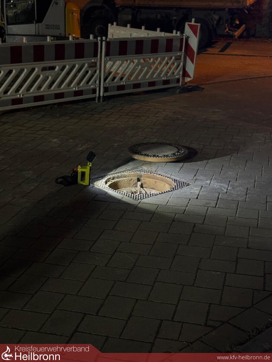 Gemeinsam mit dem Energieversorger, der Firma Syna GmbH, sowie dem GW-Mess des Landkreises Heilbronn wurden mit speziellen Gasmessgeräten permanent Messungen weiträumig um die Einsatzstelle durchgeführt, während die Baufirma die Gasleitung an einer anderen, höher gelegenen Stelle in der Straße freilegte und schließlich mit Spezialwerkzeug und einer Blase abdichten konnte. Für die Bauarbeiten stellten wir auch die Beleuchtung mit einer Netzersatzanlage an der Einsatzstelle sicher.