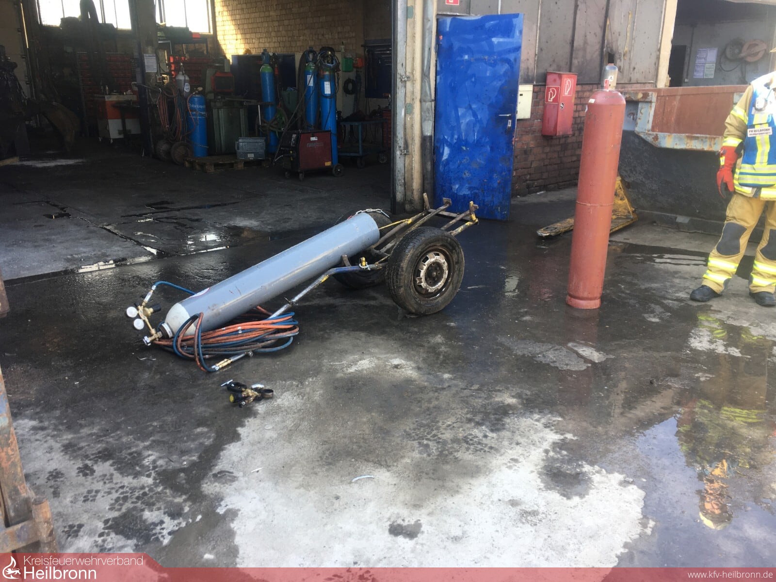 Zu einer brennenden Acetylengasflasche wurde die Feuerwehr gegen 14.06 Uhr zu einer Firma in die Benzstraße gerufen. Ein Mitarbeiter des metallverarbeitenden Betriebes hatte die Flammen bemerkt und den Notruf abgesetzt. Die Flasche wurde aus sicherer Deckung gekühlt und das Feuer gelöscht. Nach einer Temperaturkontrolle brachten die Einsatzkräfte den Druckbehälter aus der Halle, wo er noch ca. 30 Minuten überwacht wurde. Nach dem Belüften des verrauchten Gebäudes konnte die Einsatzstelle an einen Betriebsangehörigen übergeben werden.