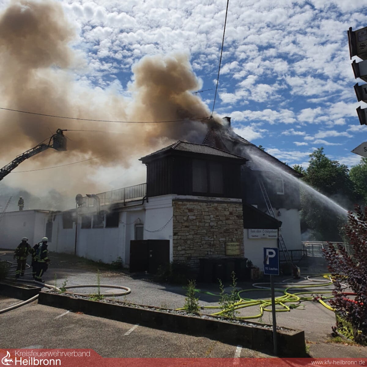 Da die Rauchsäule des Gebäudebrandes weithin sichtbar war und die Wasserversorgung im Außenbereich nicht ausreichend ist, wurde durch den Kommandanten sofort die Nachalarmierung der Berufsfeuerwehr Heilbronn und der Feuerwehr Neckarsulm veranlasst. Beim Eintrefffen des ersten Fahrzeug an der Einsatzstelle konnte hinsichtlich der Gefahr durch die Schießanlage gleich Entwarnung gegeben werden, das es sich beim betroffenen Gebäude um den Gaststättenbetrieb gehandelt hat, aus welchem die Flammen herausgeschlagen haben.