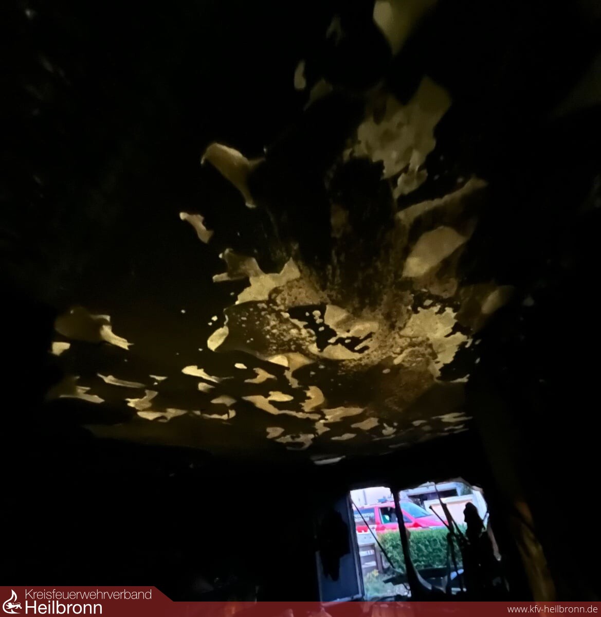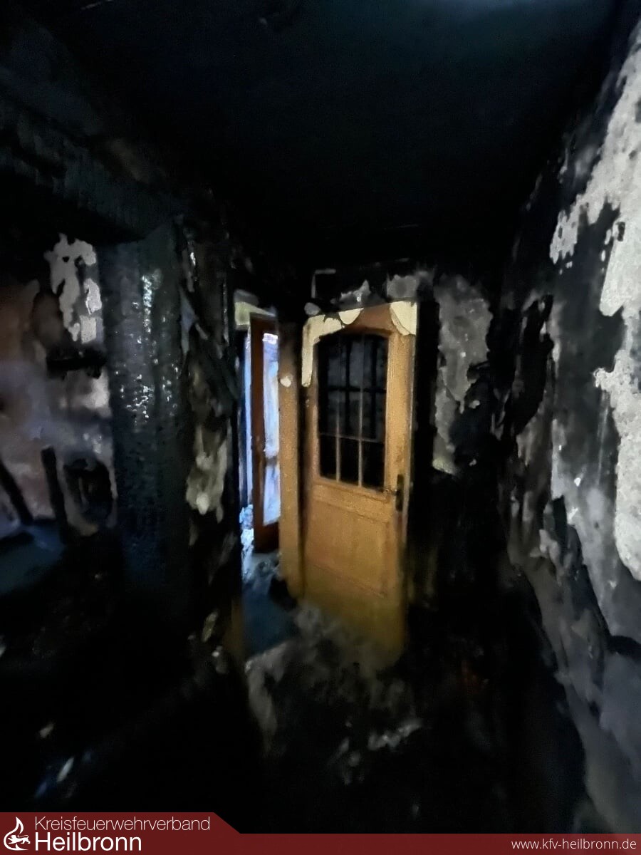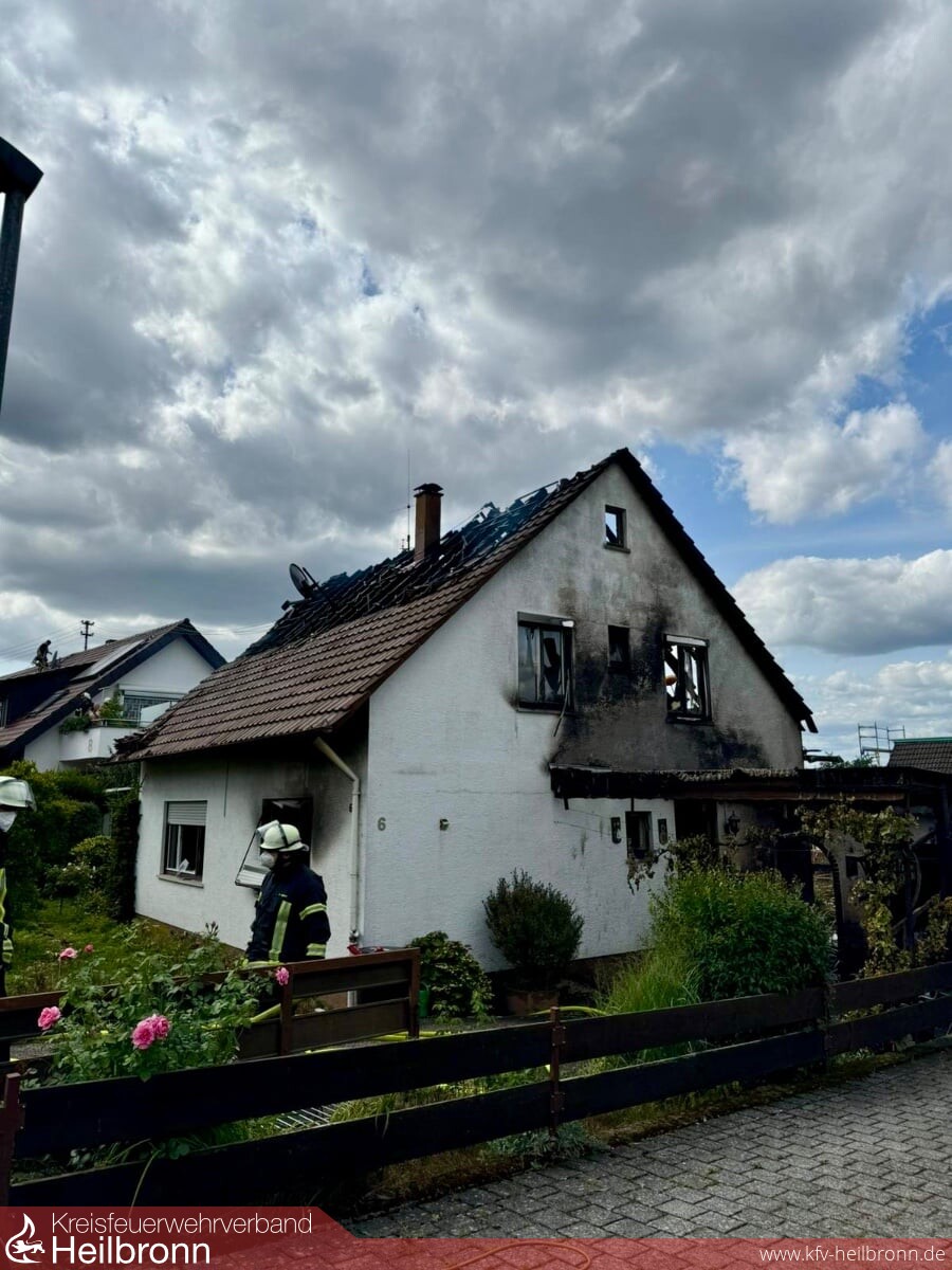 Mit der Drehleiter wurden parallel zum Innenangriff weitere Löschmaßnahmen von Außen durchgeführt, aufgrund der starken Brandeinwirkung auf das Tragwerk drohte im weiteren Einsatzverlauf das Dachgeschoss in Teilen einzustürzen. Aufgrund der daraus resultierenden zu hohen Eigengefährdung, mussten sich die Trupps aus Sicherheitsgründen aus dem Innenangriff zurückziehen. Das diese Entscheidung richtig war, bestätigte sich spätestens zu dem Zeitpunkt, als Teile der Dachkonstruktion in den Treppenraum stürzten. Glücklicherweise konnte früh zu Einsatzbeginn geklärt werden, das sich keine Personen im Gebäude aufgehalten hatten. Über die ENBW wurden parallel sämtliche Stromleitungen getrennt und das Gebäude stromlos geschalten. Nachdem das Feuer unter Kontrolle war, wurden weitere Teile der Dachhaut über die Drehleiter geöffnet und durch die Fachgruppe Absturzsicherung der Feuerwehr Bad Friedrichshall gezielte Nachlöscharbeiten vorgenommen. Aufgrund der hohen Anzahl an benötigten Atemschutzgeräten wurde bereits frühzeitig der Abrollbehälter Atemschutz der Berufsfeuerwehr Heilbronn an die Einsatzstelle alarmiert.