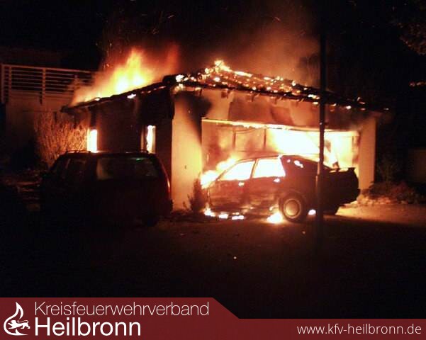 Beim Eintreffen des ersten Fahrzeuges an der Einsatzstelle brannten das Walmdach einer Doppelgarage, sowie zwei in der Garage geparkte Pkw in voller Ausdehnung. Ein Pkw welcher auf das Garagentor geprallt war, brannte ebenfalls in voller Ausdehnung.