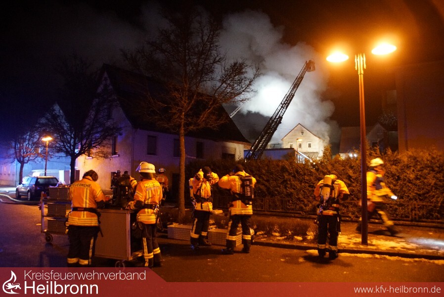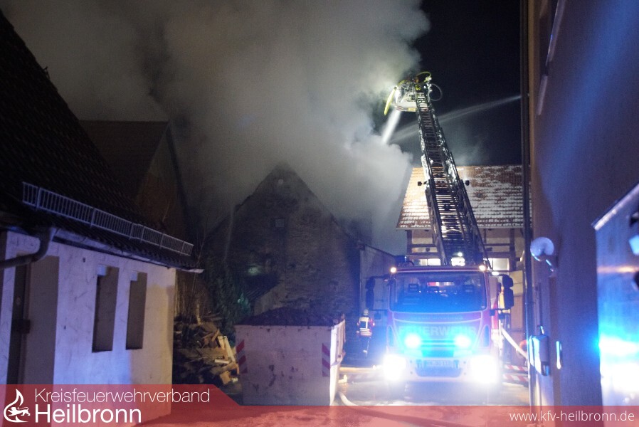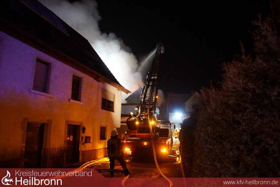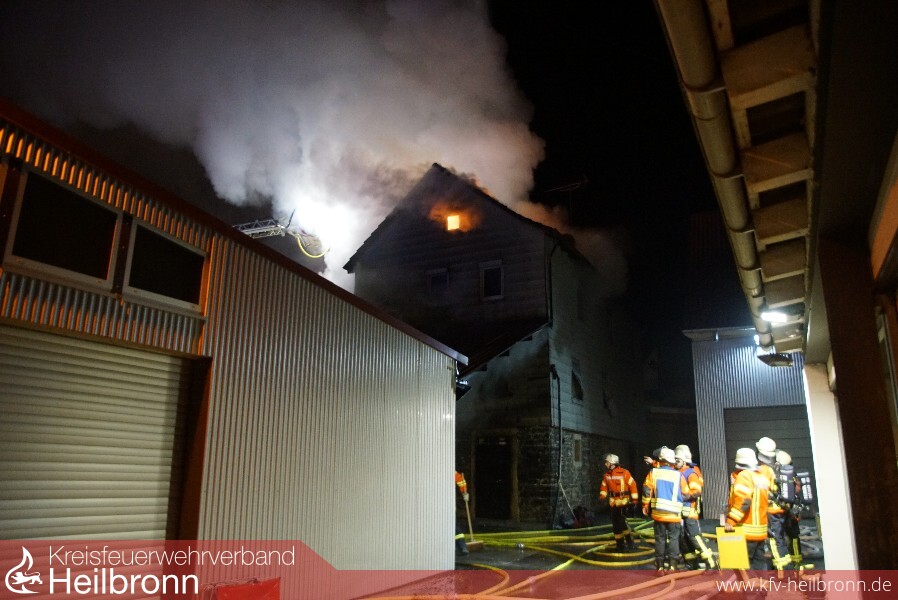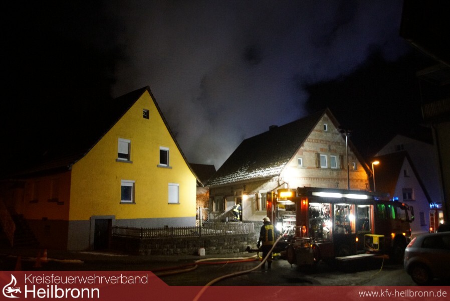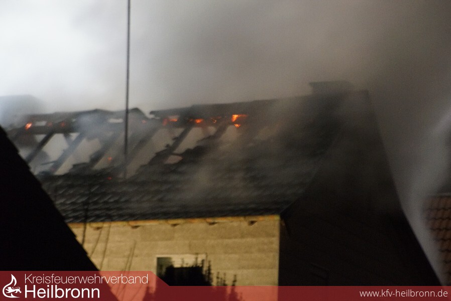 Schon auf der Anfahrt war eine starke Rauchsäule sowie ein Flammenschein zu erkennen. An der Einsatzstelle stellte sich heraus, dass ein Dachstuhl eines leerstehenden Mehrfamilienhauses und die angebaute Scheune in Flammen standen. Sieben Minuten nach der Alarmierung war die Abteilung Obergimpern vor Ort und bereitete den ersten Löschangriff vor. Nach dem Eintreffen weiterer Abteilungen waren mehrere Trupps unter Atemschutz zur Brandbekämpfung und Personensuche im Innenangriff, da Anfangs nicht klar war, ob sich noch Personen im Gebäude befanden. Dies war jedoch nicht der Fall. Zur schnellen und massiven Brandbekämpfung hatten die Feuerwehren Bad Wimpfen und Bad Rappenau jeweils eine Drehleiter mit einem Wenderohr im Einsatz. Die Feuerwehr Neckarsulm war mit dem Einsatzleitwagen 2 und dem Gerätewagen Messtechnik im Einsatz, welche jedoch nach kurzer Zeit wieder einrücken konnten. Der Abrollbehälter Atemschutz der Berufsfeuerwehr Heilbronn war ebenfalls vor Ort.