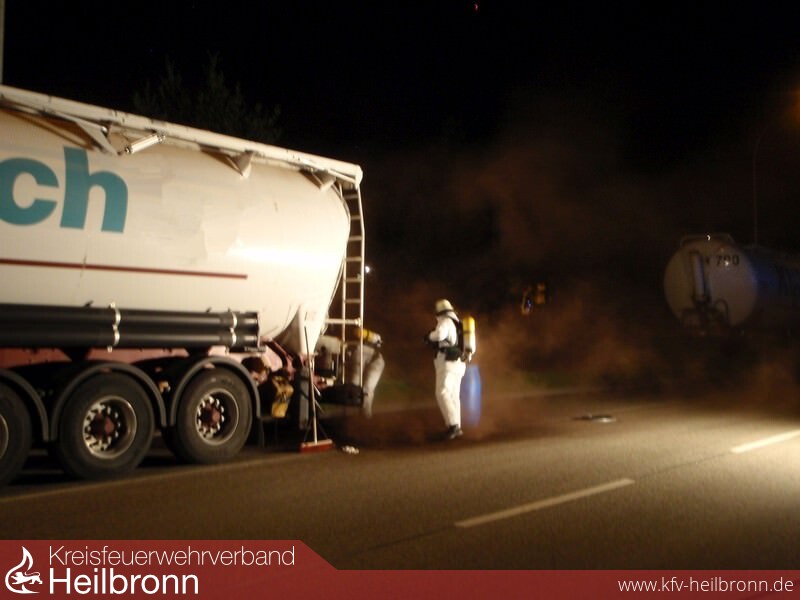 Passanten hatten an drei abgestellten Sattelaufliegern mit Gefahrgutkennzeichnung das Austreten eines qualmenden Feststoffes bemerkt.