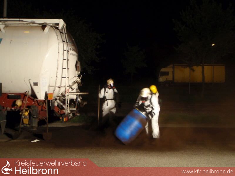 Die Einsatzkräfte nahmen unter Schutzkleidung das ausgetretene Material in Kunststofffässern auf und führten Reinigungsmaßnahmen durch.