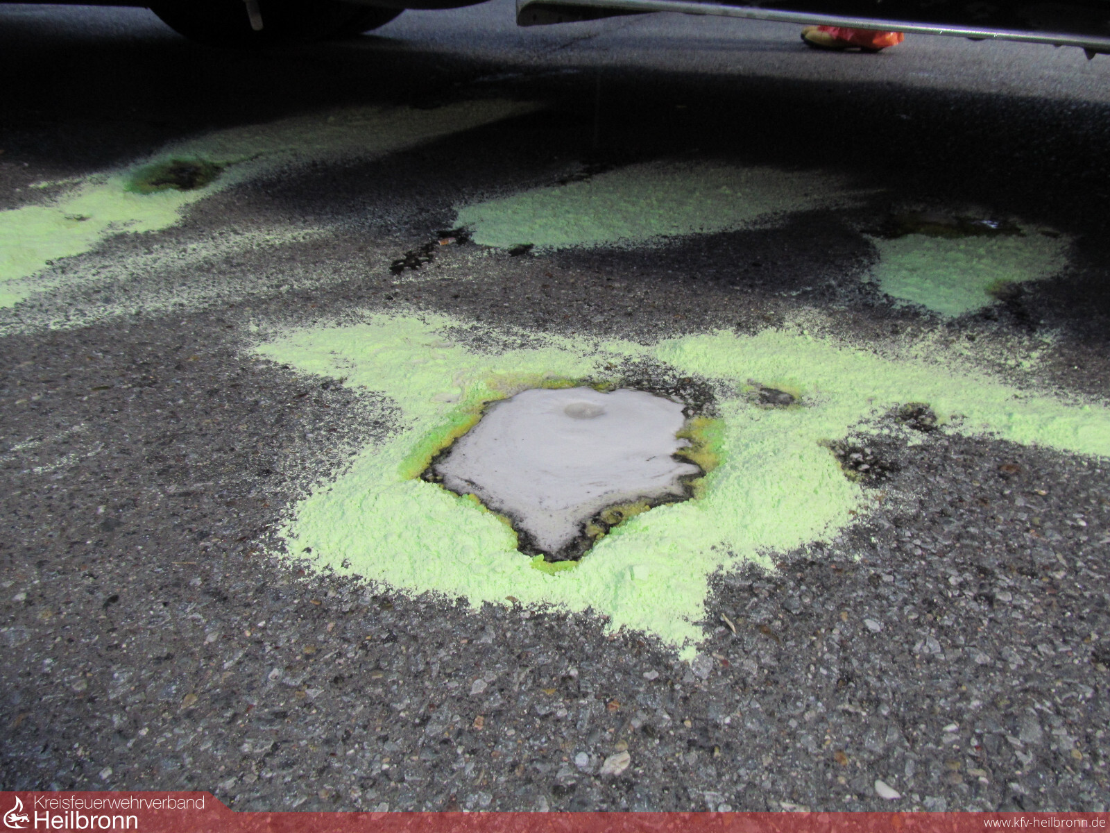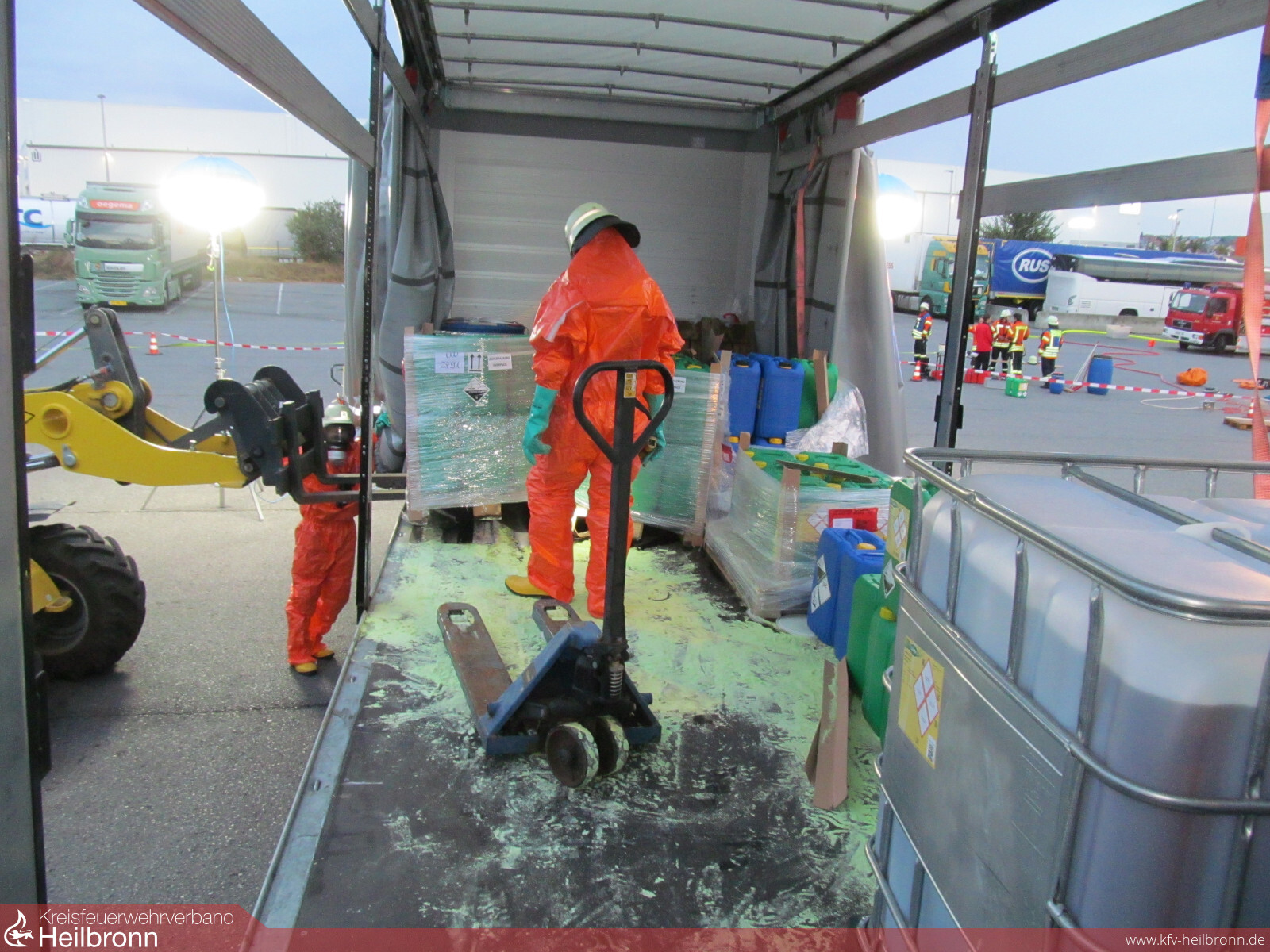 Nach der Feststellung der Säure wurde der LKW an den Seiten geöffnet. Dieser war beladen mit diversen Behältnissen mit unterschiedlichen chemischen Stoffen. Um den defekten Kanister zu finden, wurde der LKW entladen. Nachdem der defekte Behälter gefunden wurde, wurde dieser in ein beständiges Behältnis umgeladen. Der defekte Kanister enthielt ein Beizmittel, zusammengesetzt aus den Chemikalien Phosphorsäure und Flusssäure.
