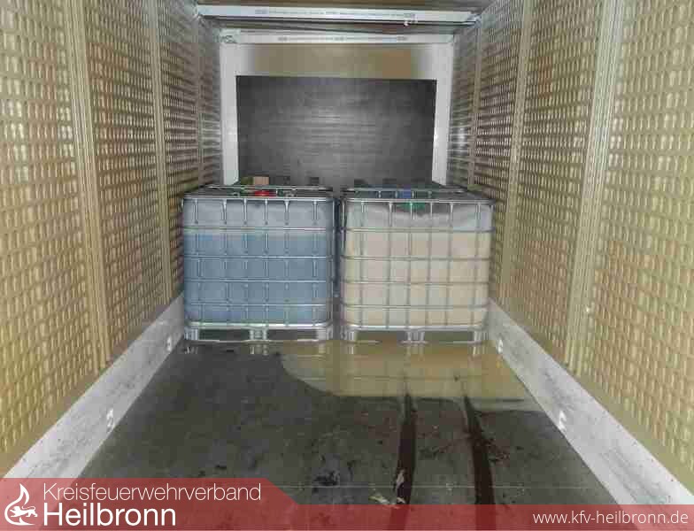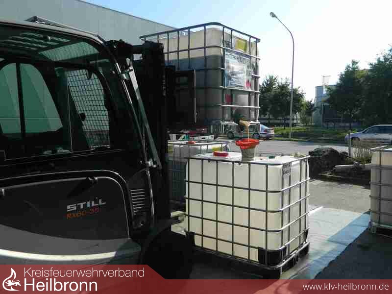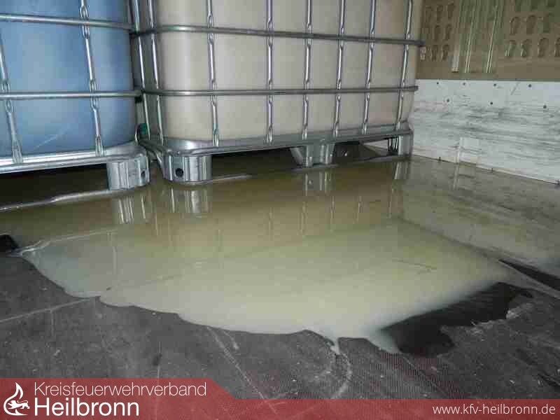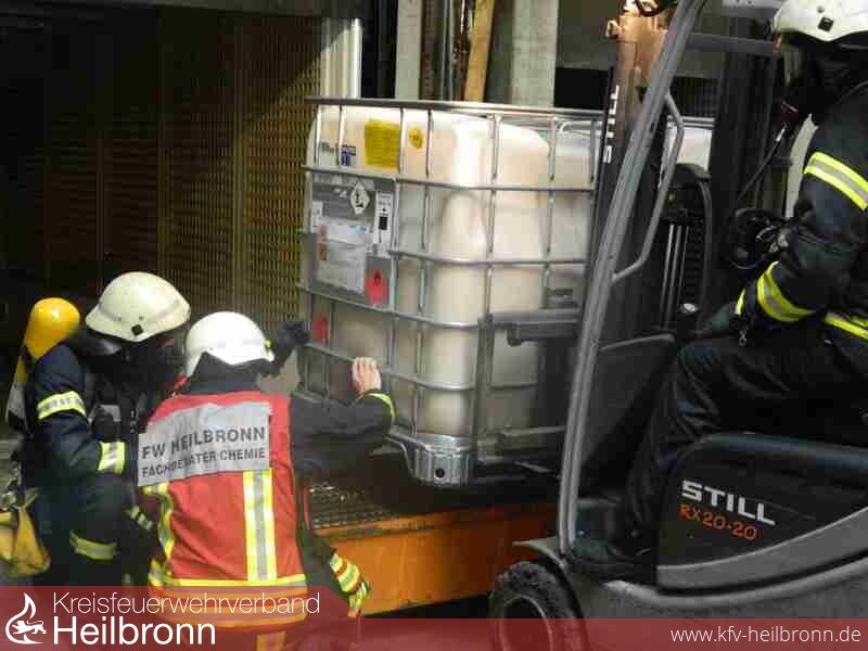 In Absprach mit dem Fachberater „Chemie“ der Feuerwehr Heilbronn, wurde die Flüssigkeit in einen Ersatzbehälter umgefüllt und die ausgetretene Menge mit Bindemittel beseitigt.