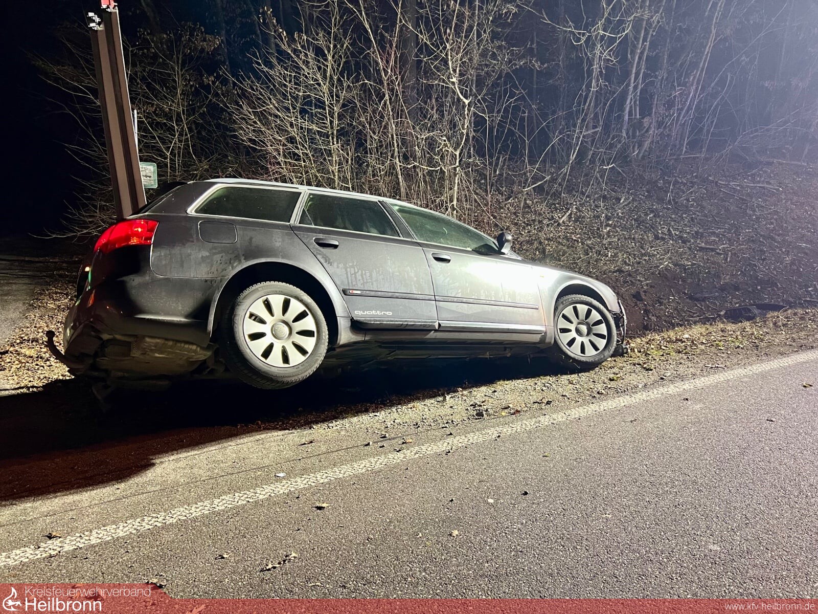 Ein Audi Kombi war, ohne fremdeinwirkung in den Straßengraben geraten und dort liegen geblieben. Die zuerst eintreffende Polizeistreife stellte eine Rauchentwicklung im Bereich der Motorhaube fest. Die Feuerwehr Talheim kontrolliert den Motorraum und klemmte die Batterie des verunfallten Fahrzeuges ab und übergab ihm Anschluss die Einsatzstelle an die Polizeistreife.