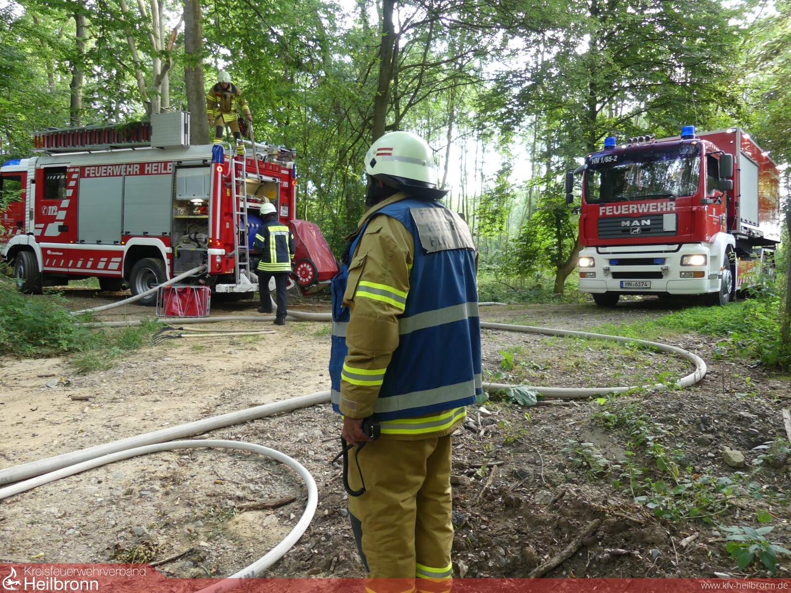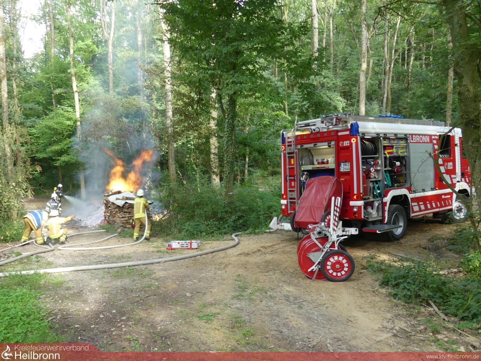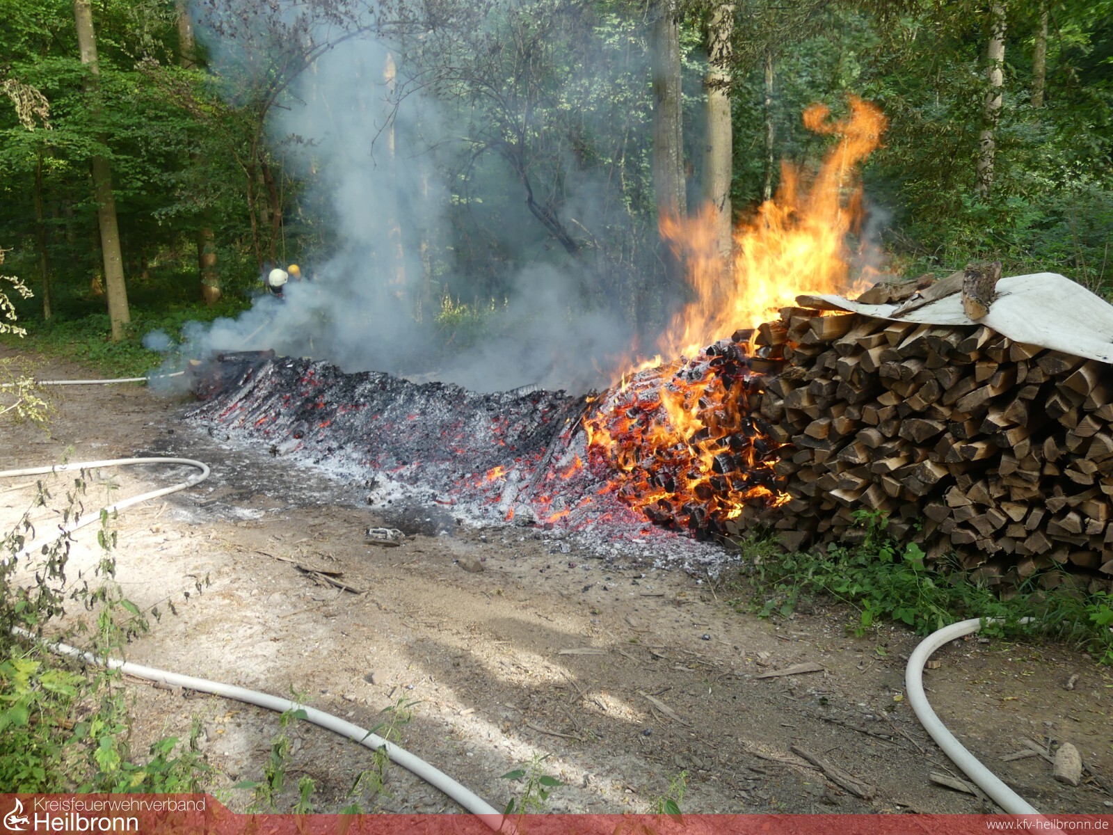 Vor Ort stellte sich heraus, dass ein dort gelagerter Holzstapel auf einer Länge von ca. 8 Meter in Brand geraten war. Das Feuer drohte auf umstehende Bäume und das Unterholz überzugreifen.