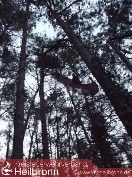Die alarmierten Kräfte der Abteilungen Heinsheim und Bad Rappenau machten den Piloten rasch ausfindig und nahmen Kontakt mit ihm auf. Der Gleitschirmflieger konnte ein Seil nach unten lassen, an welchem er eine Bandschlinge nach oben zog, um sich damit am Baumstamm zu sichern.