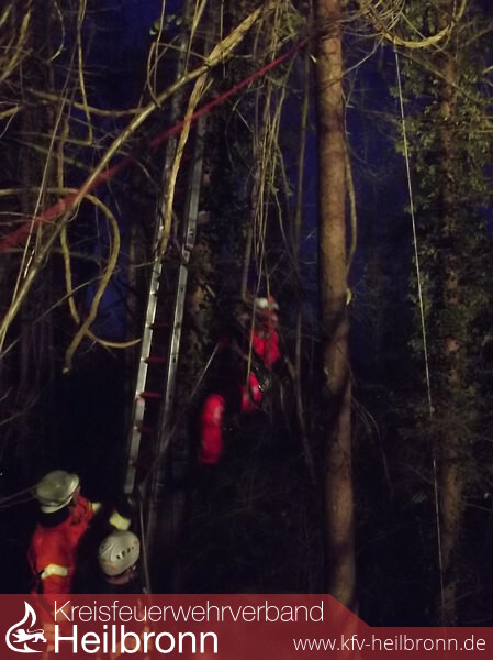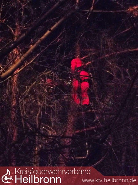 Die in Bereitstellung stehende Drehleiter konnte wegen des unwegsamen Geländes nicht eingesetzt werden. Die nachgeforderte Höhenrettungsgruppe der Berufsfeuerwehr Heilbronn brachte einen Höhenretter in die Baumkrone um den Piloten aus ca. 12 Metern Höhe abzuseilen.