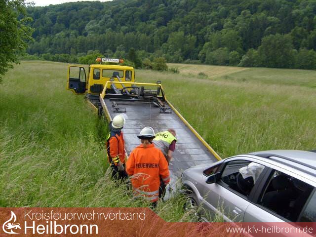 Zur Aufnahme von ausgelaufenem Öl nach einem Verkehrsunfall wurde die FFW Jagsthausen / Olnhausen durch die Leitstelle Heilbronn auf die Landstraße L 1025 zwischen Olnhausen und Widdern gerufen. Ein aus Olnhausen kommender Motorradfahrer hatte vermutlich eine scharfe Rechts-Kurve unterschätzt und geriet mit seinem Motorrad auf die Gegenfahrbahn. Eine aus Widdern kommende Autofahrerin reagierte geistesgegenwärtig und lenkte ihr Fahrzeug auf eine sich neben der Fahrspur befindlichen Wiese, um den Zusammenstoß beider Fahrzeuge zu vermeiden. Dabei lösten Fahrer- und Beifahrer-Airbag im PKW aus, die Frau blieb unverletzt. Der Motorradfahrer kam zu Fall, zog sich dabei jedoch glücklicherweise ebenfalls keine ernsteren Verletzungen zu. Aufgrund des Sturzes brach der Motorblock der Maschine und das sich darin befindliche Öl verteilte sich auf der Fahrbahn. Die L 1025 musste kurzzeitig gesperrt werden, um das ausgelaufene Öl aufzunehmen. Zwischenzeitlich wurden PKW und Motorrad auf Abschlepper verladen und die Fahrbahn konnte nach kurzer Zeit für den Verkehr wieder freigegeben werden.