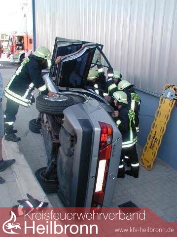 Der Pkw Marke Mercedes-Benz stürzte um und blieb auf der Beifahrerseite liegen. Während sich der unverletzte Fahrer selbst aus dem Fahrzeug befreien konnte, musste die leicht verletzte Beifahrerin durch das Schiebedach von der Feuerwehr befreit werden.