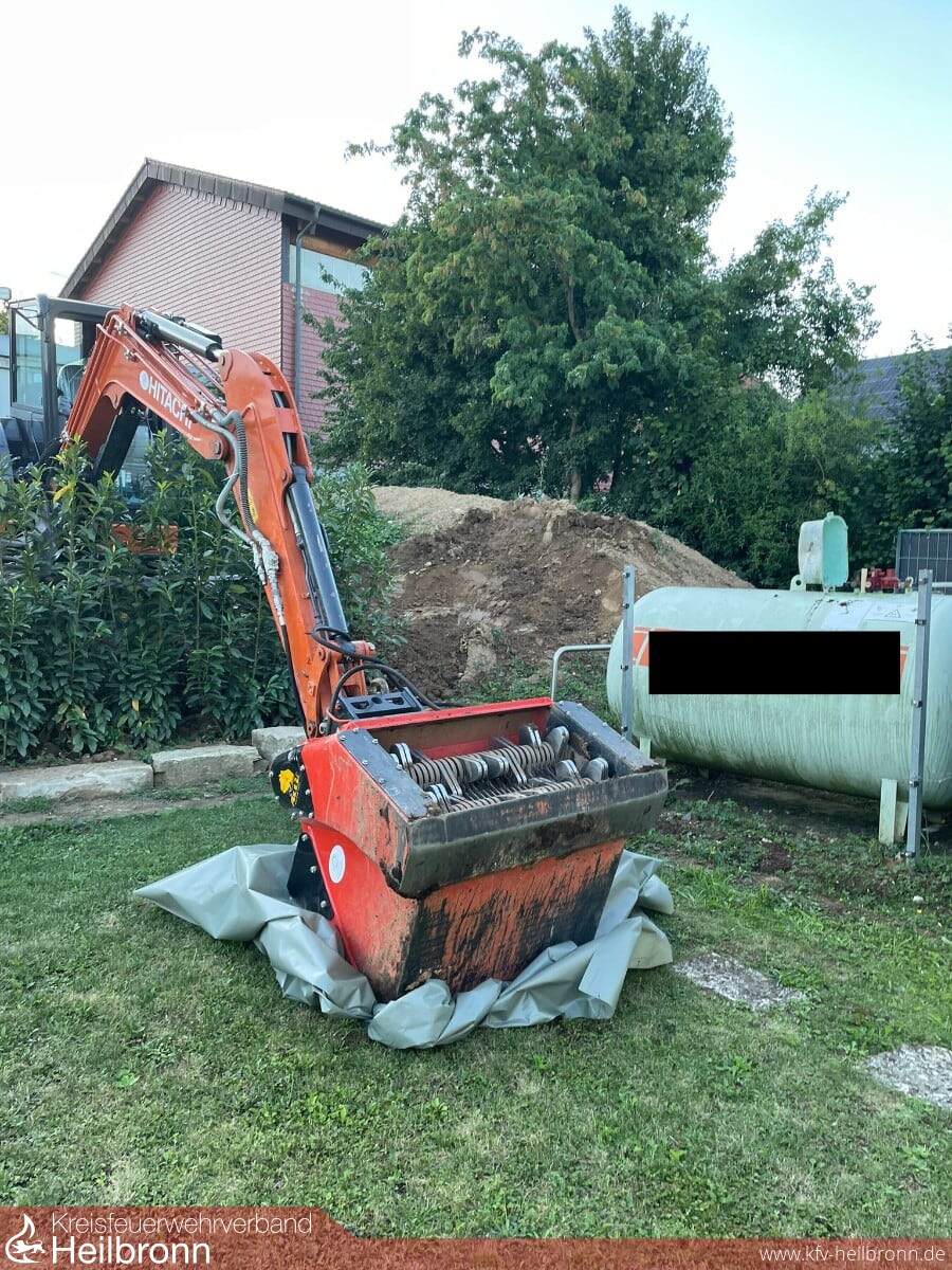 Glück im Unglück hatten viele Beteiligte bei diesem Notfall in Obersulm Willsbach. In einem privaten Garten kam es zu einen Unfall, bei dem ein Bagger bei Arbeiten das Ventil eines Flüssiggastanks touchierte, wodurch dieses abriss. Erfreulicherweise entzündete sich das brennbare Gas hierbei nicht, sonst hätte eine Explosion größeren Schaden anrichten können. Durch die beinahe komplette Ausströmung in Form einer haushohen Fontäne trat eine beträchtliche Menge des Gases aus. Entsprechend wurde via Warn-App NINA die Bevölkerung in einem Umkreis von einem Kilometer um die Einsatzstelle in Willsbach gewarnt, damit Zündfunken oder offene Feuerstellen wie beispielsweise in Betrieb befindliche Grills vermieden werden können.