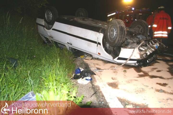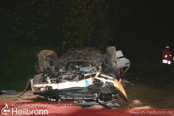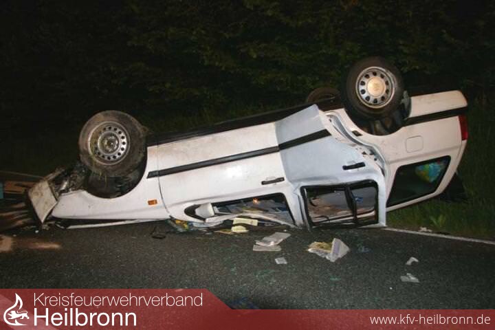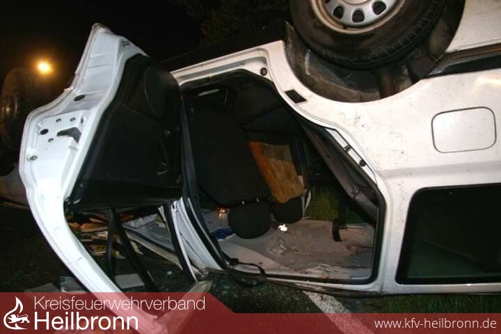 Auf der Fahrt zwischen den Schwaigern Stadtteilen Niederhofen und Stetten a.H. geriet der Fahrer eines PKW in einer langezogenen Rechtskurve nach links auf das Banket, kam dadurch ins Schleudern, stürzte um und kam auf dem Dach zum liegen. Im Bereich von Fahrer- und Beifahersitz war das Dach stark eingedrückt. Die beiden Insassen wurden dabei aber glücklicherweise nur mittelschwer verletzt. Sie konnten selbst durch eine der hinteren Türen ins Freie retten. Beide wurden vom Rettungsdienst übernommen und ins Krankenhaus gebracht.